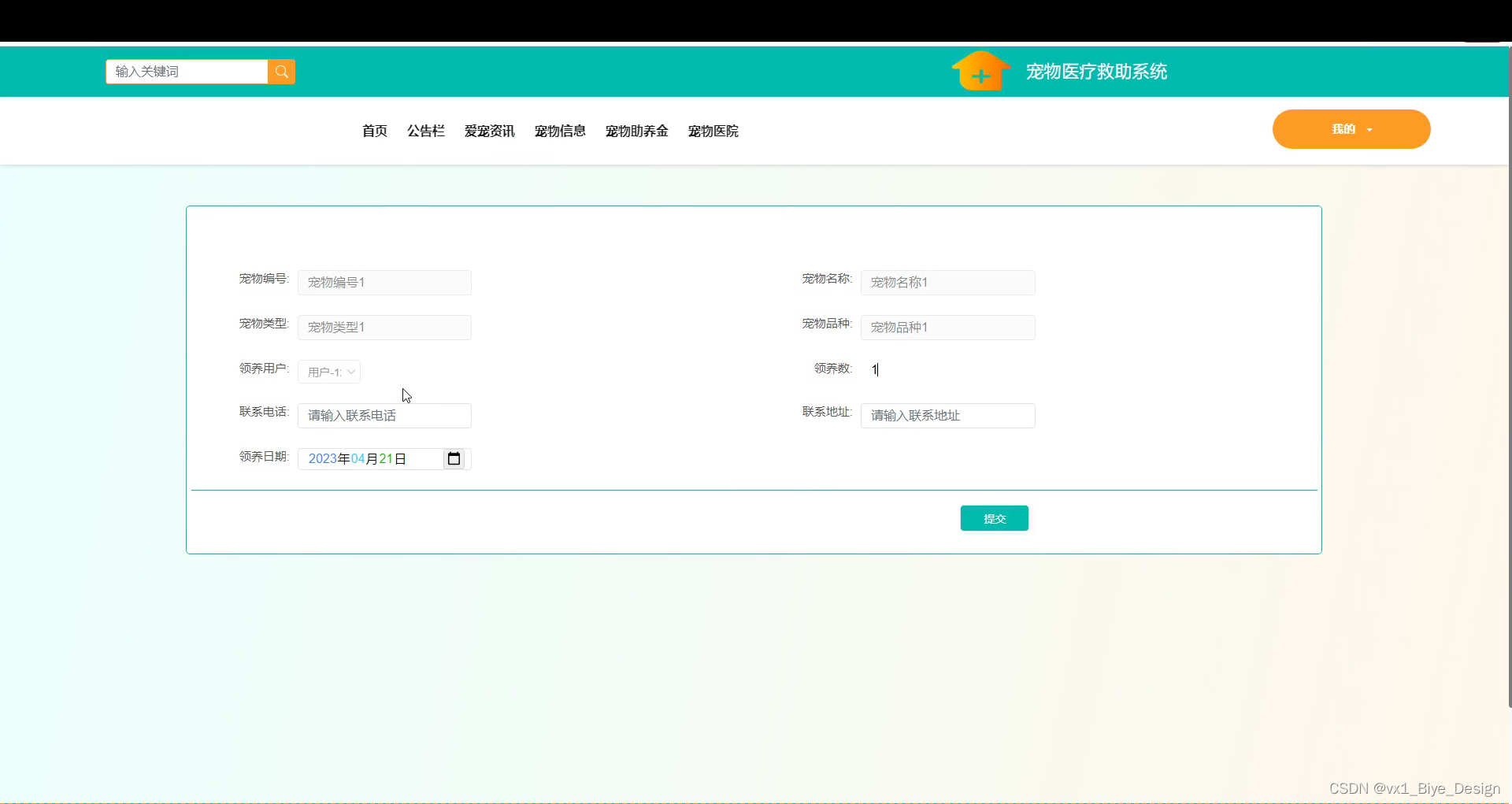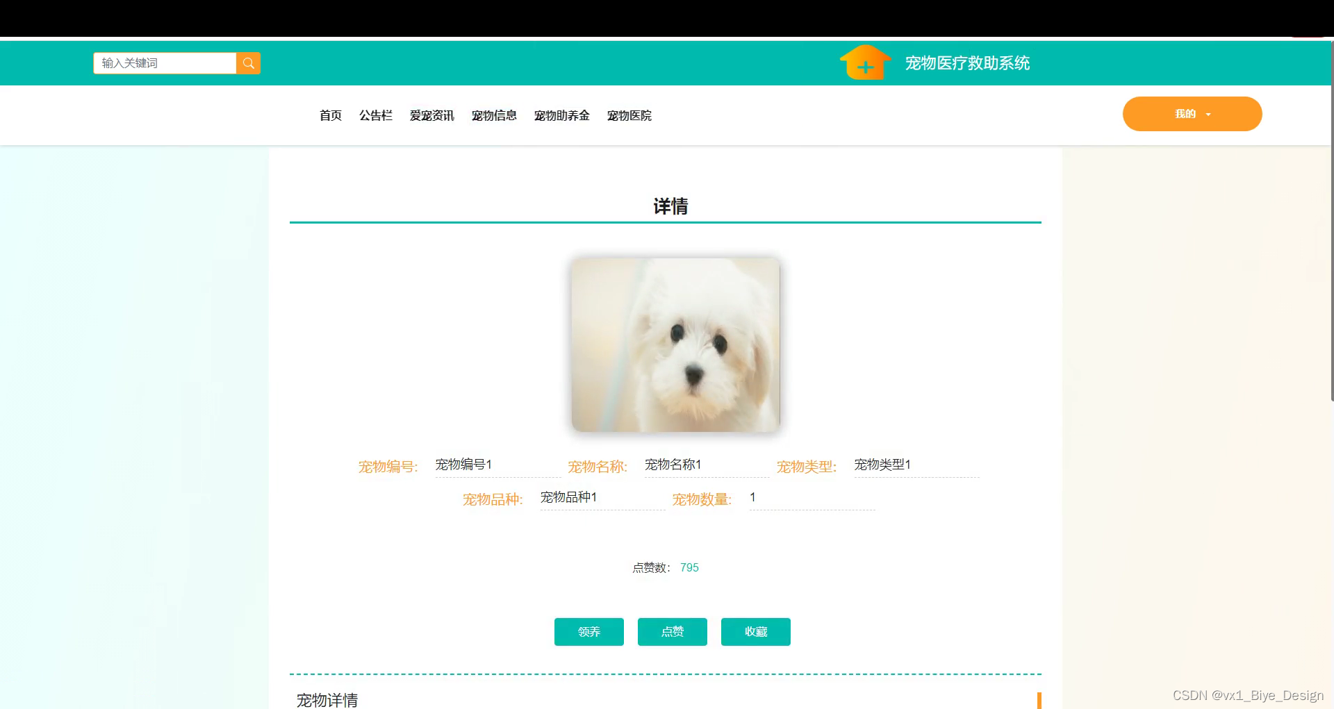 宠物信息,在此界面可以查看和搜索可领养的宠物信息,可以进行收藏,点赞,领养等操作,如下图所示。