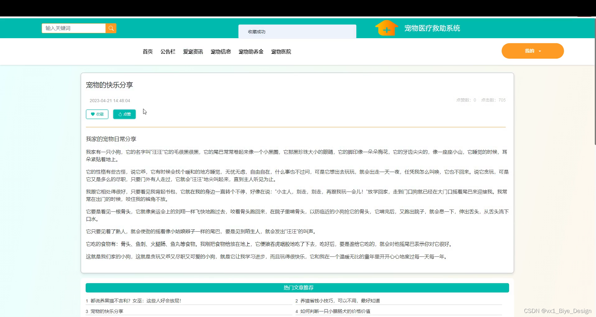 爱宠资讯,在此页面可以查看推荐的资讯信息,并通过筛选,排序等操作进行资讯信息查询,进入资讯详情界面后可以进行收藏,点赞,评论等操作,如下图所示。