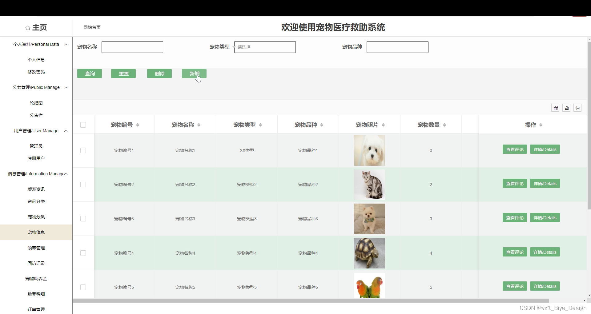 宠物信息,管理员在此页面可以查看可领养的宠物信息,包括宠物编号,名称,类型,品种,照片等信息,并可根据需要进行查询,重置,删除,新增等操作, 如下图所示。
