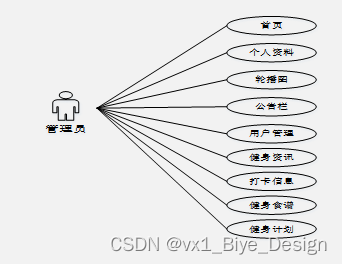 通过管理员功能页面,用户可以查看首页、个人资料、公共管理(轮播图、公告栏)用户管理(管理员、普通用户)信息管理(健身资讯、资讯分类)打卡信息、健身食谱、健身计划等,并且可以根据需要进行相应的操作,如图5-7所示。