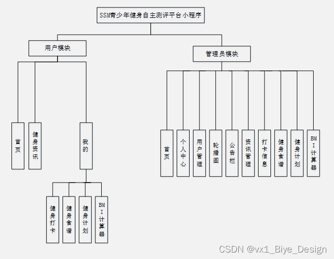 通过使用微信小程序的青少年健身自主测评平台,我们可以实现多种功能,从而满足用户的各种需求。该系统的功能结构如图4-5所示,具有良好的完整性和可靠性。