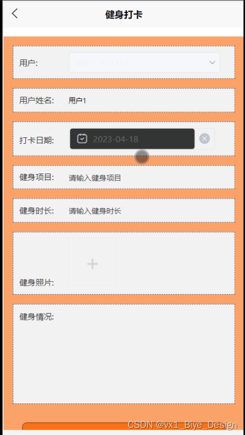 健身打卡信息页面可以查用户、用户姓名、打卡日期、健身项目、健身时长、健身照片、健身情况等提交打卡信息。如图5-5所示。