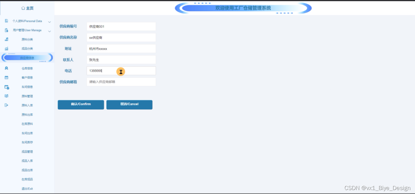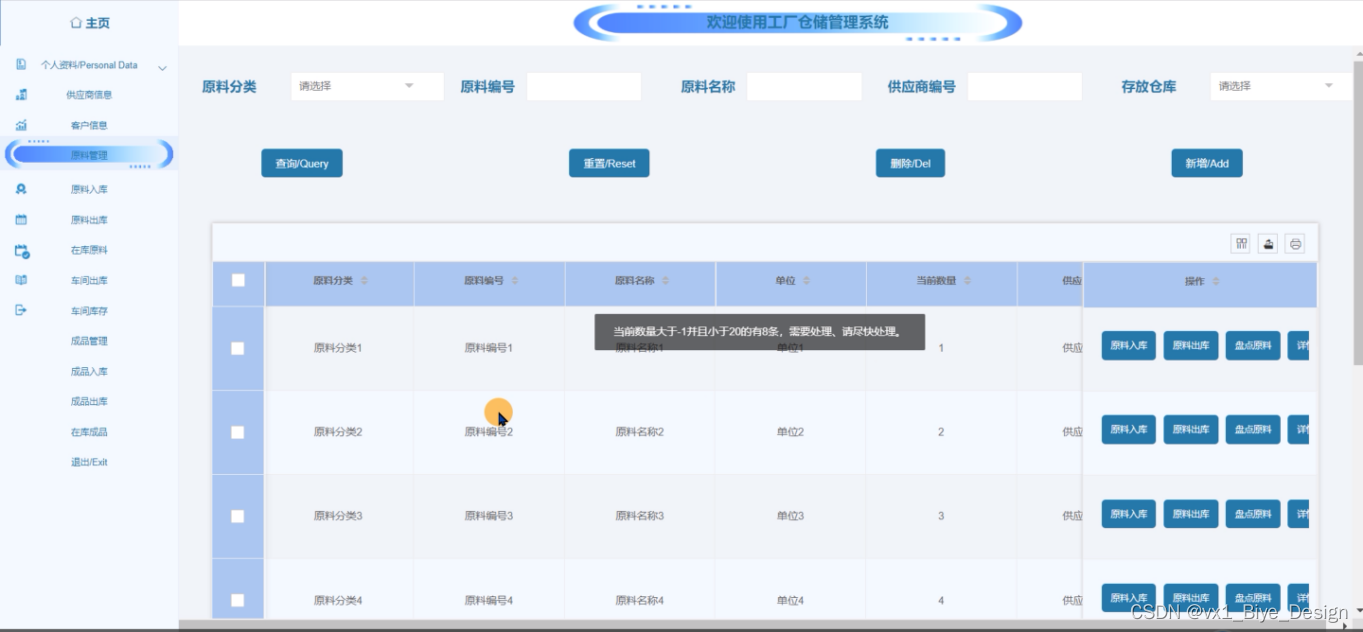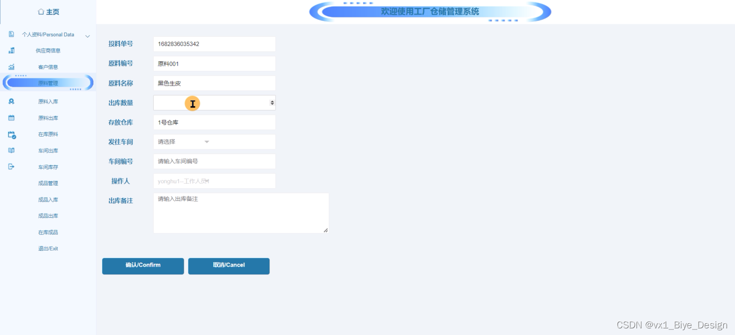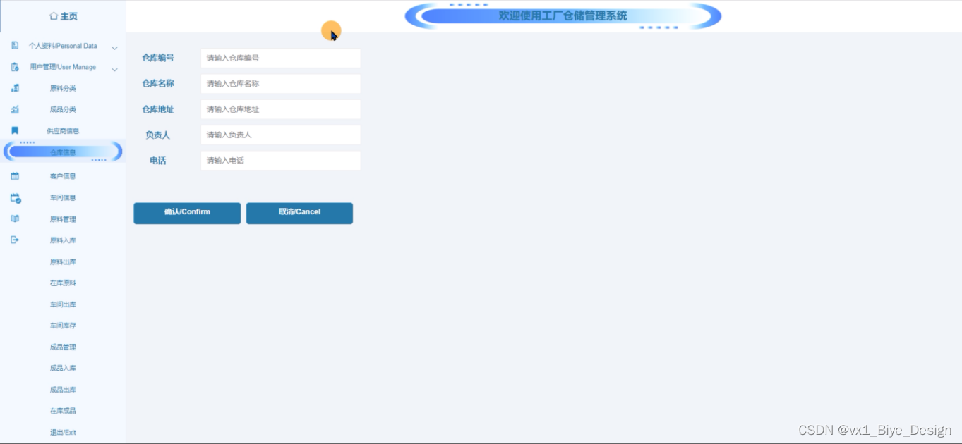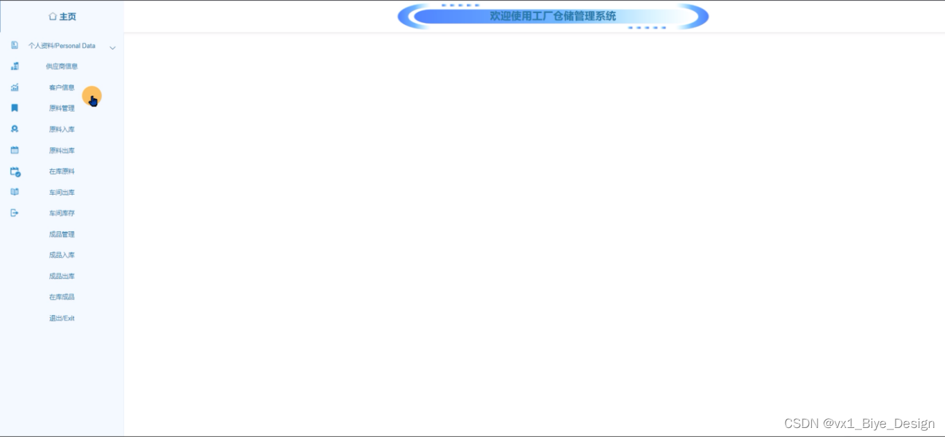 工作人员登录进入工厂仓储管理系统之后,就可以对所有的信息进行查看,可以查看到主页、个人资料、供应商信息、客户信息、原料管理、原料出库、原料入库、在库原料、车间出库、车间库存、成品管理、成品出库、成品入库、在库成品等,并且还可以对其进行相应的操作管理,如图5-11所示。