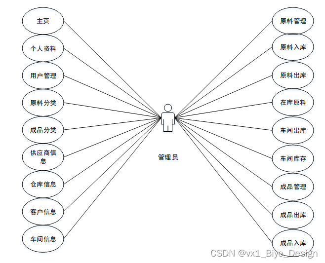 (1)管理员模块:系统中的核心用户是系统管理员,管理员登录后,通过管理员菜单来管理后台系统。主要功能有:主页、个人资料、用户管理、原料分类、成品分类、供应商信息、仓库信息、客户信息、车间信息、原料管理、原料出库、原料入库、在库原料、车间出库、车间库存、成品管理、成品出库、成品入库、在库成品等功能。管理员用例图如图3-1所示。