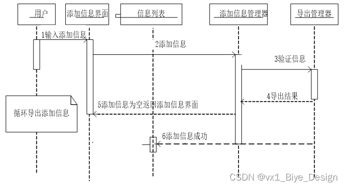 管理员、用户登录后均可进行添加信息操作,添加信息模块顺序图如图4-4所示。
