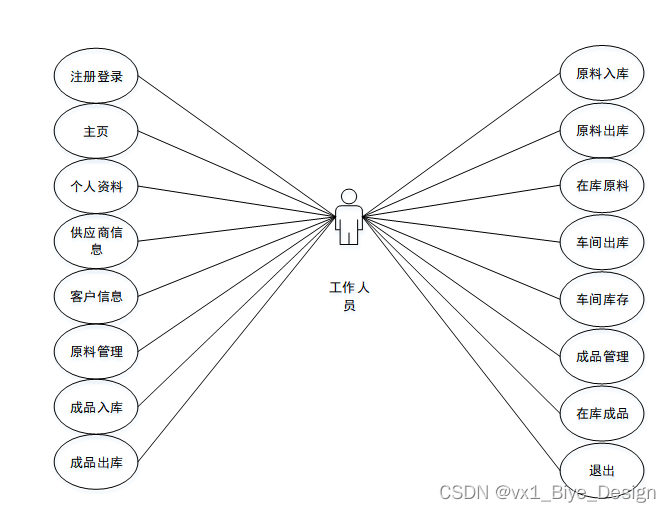 (2)工作人员:主页、个人资料、供应商信息、客户信息、原料管理、原料出库、原料入库、在库原料、车间出库、车间库存、成品管理、成品出库、成品入库、在库成品等功能。工作人员用例图如图3-2所示。