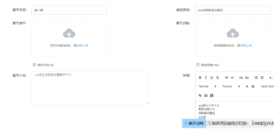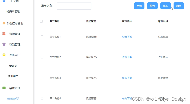 课程教学:存放课程教学信息的内容,包括章节名称,课程原理,章节课件,章节介绍等数据项。