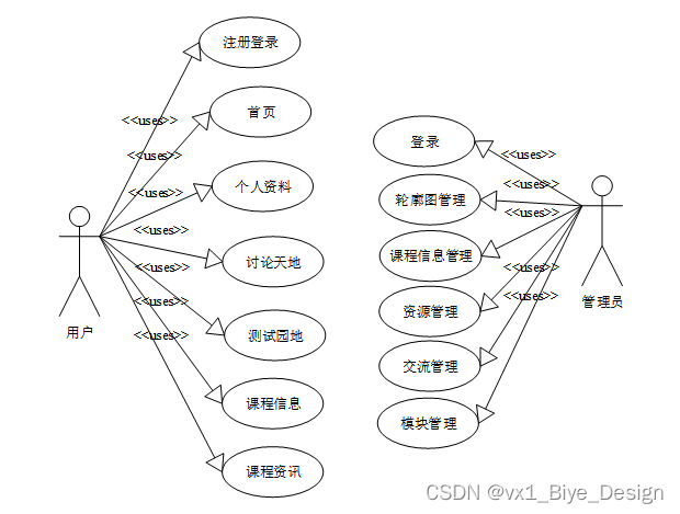 数字电子技术课程网站的功能主要分为前台用户根据自己的需求进行注册登录,浏览课程教学信息并对选中的课程教学信息进行下载操作。后台系统管理员因职责的不同,管理员主要对课程信息发布进行发布管理操作。系统用例图如下所示。