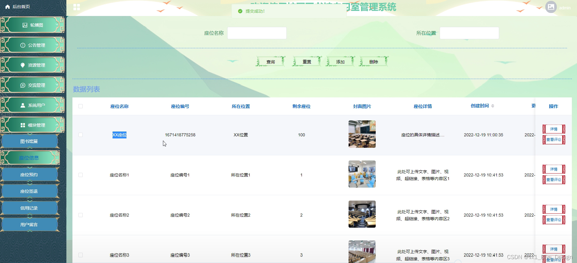 座位管理模块:管理员查看自习室座位表,并且添加座位数据,也能够删除座位数据。