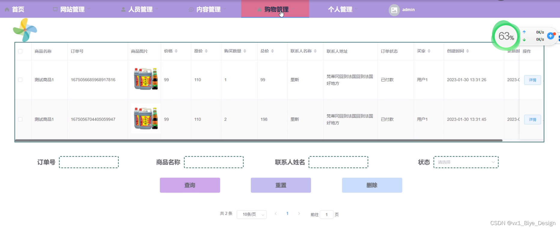 普通用户在系统前台购买商品后,提交订单,后台将生成用户提交的订单,管理员需要处理订单,审核订单,删除、修改订单等操作。