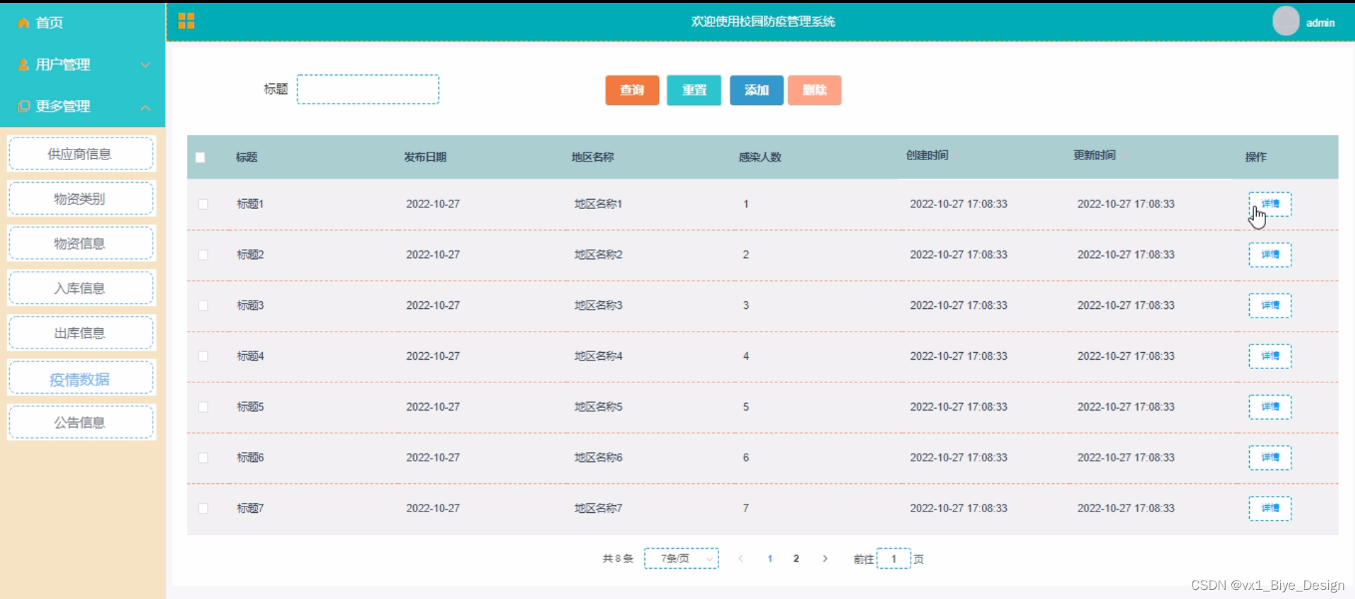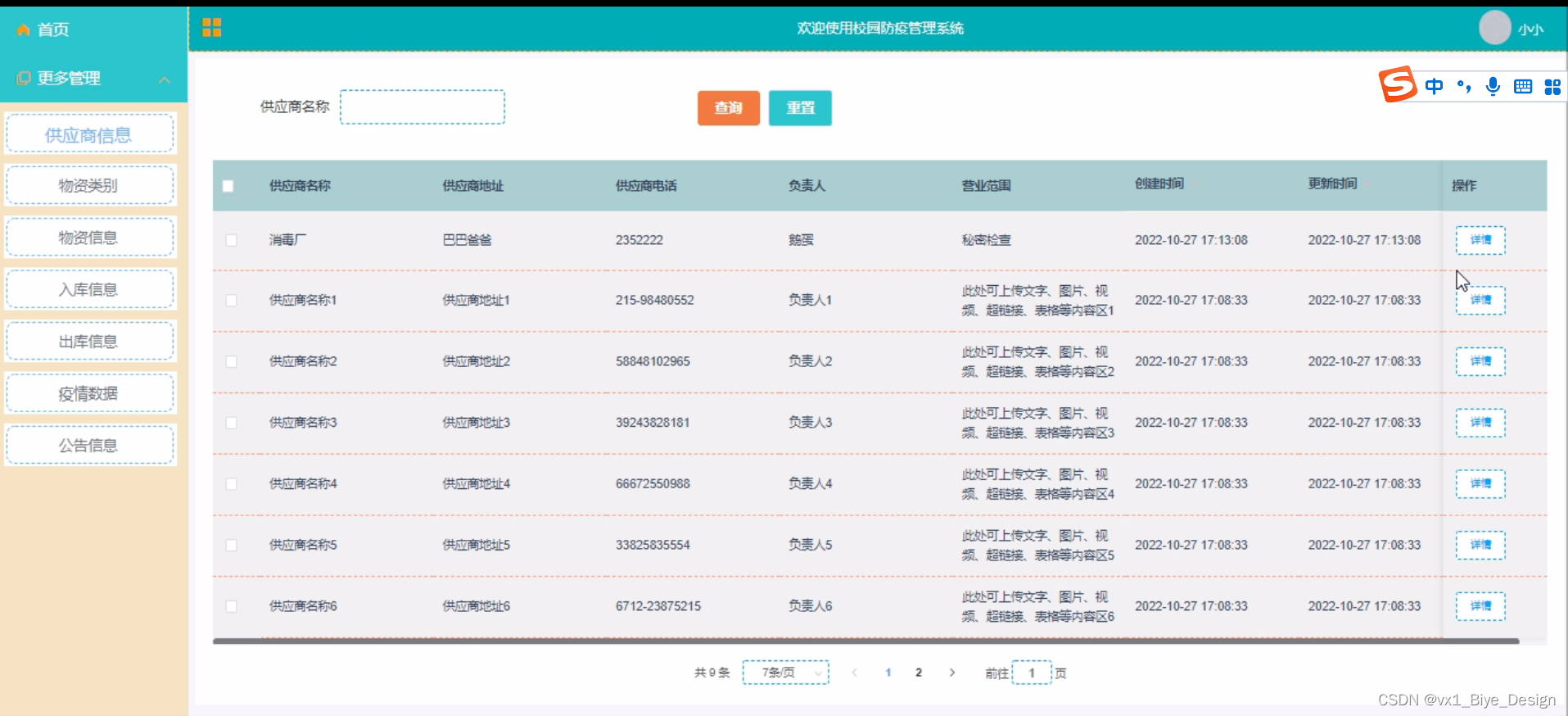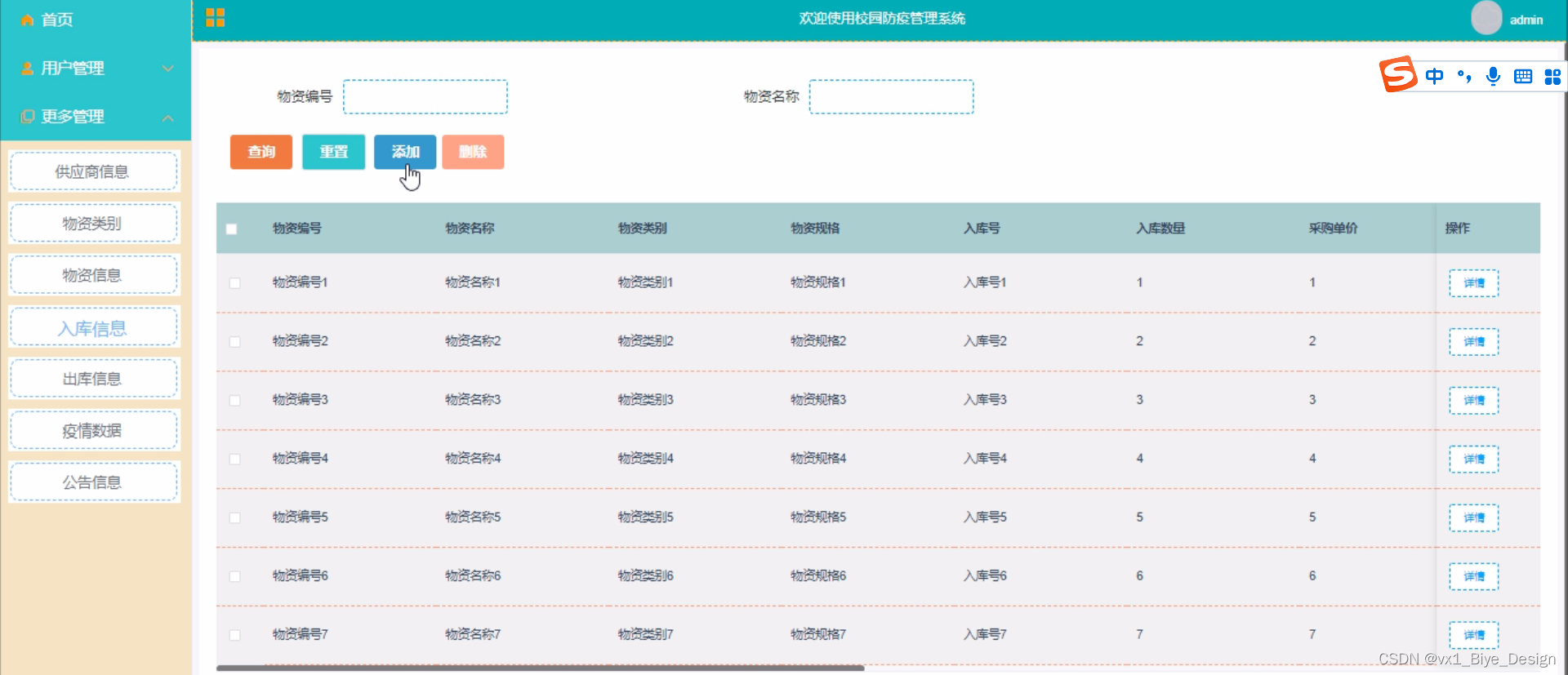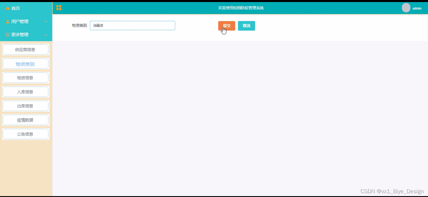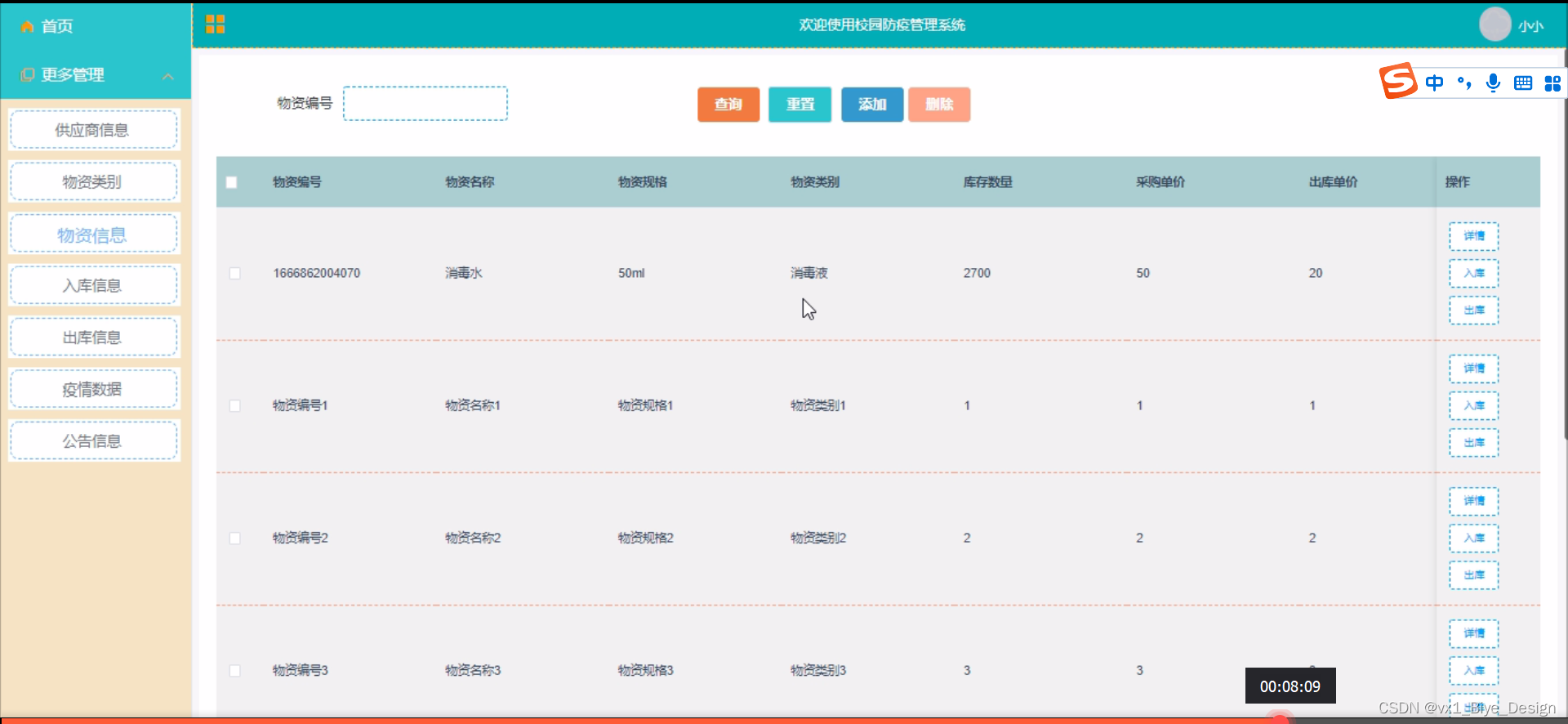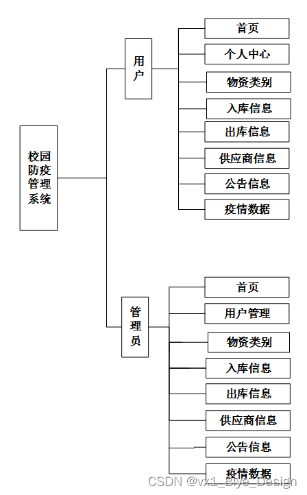校园防疫管理系统,主要的模块包括查看首页、用户管理(管理员、注册用户)更多管理(供应商信息、物资类别、物资信息、入库信息、出库信息、疫情数据、公告信息)等功能。系统中管理员主要是为了安全有效地存储和管理各类信息,还可以对系统进行管理与更新维护等操作,并且对后台有相应的操作权限。