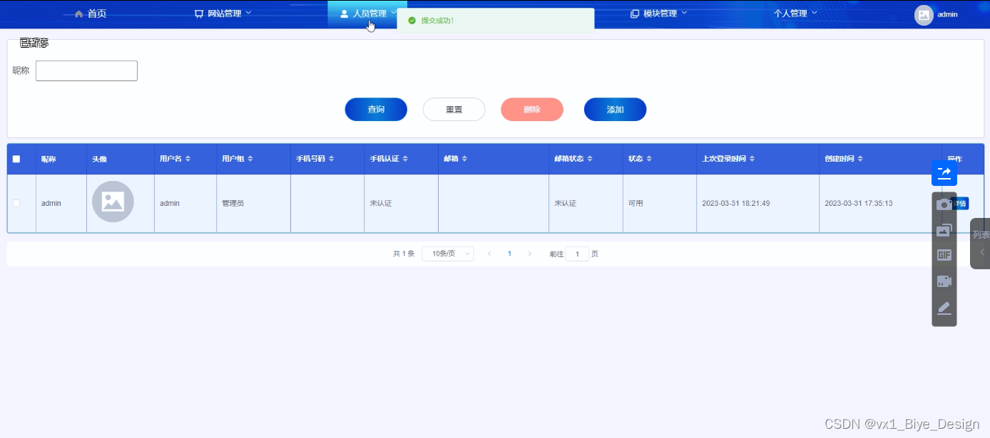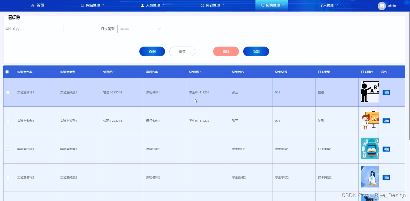 (2)人员管理:当点击“人员管理”这一菜单的时候,会出现管理员+学生用户+管理用户三个子菜单,可以对这三个模块进行增删改查操作;