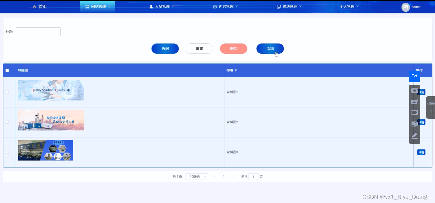 管理员可以对系统前台展示的轮播图以及公告信息进行增删改查,方便用户进行查看。界面如下图4-9所示。