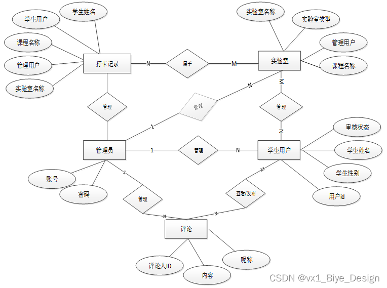 下面是整个实验室打卡系统小程序中主要的数据库表总E-R实体关系图。