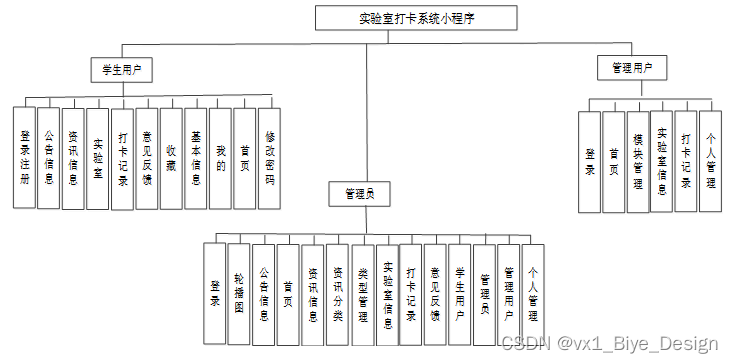 实验室打卡系统小程序是中需要存储不少实验室信息,其模块功能结构,具体的结构图如下: