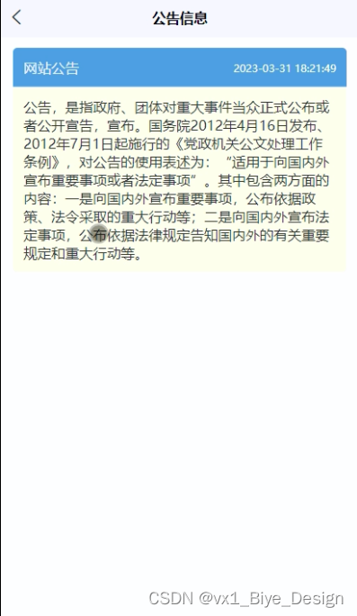 (3)公告信息:用户进行公告信息的阅览,查看管理者发布的行公告消息信息。