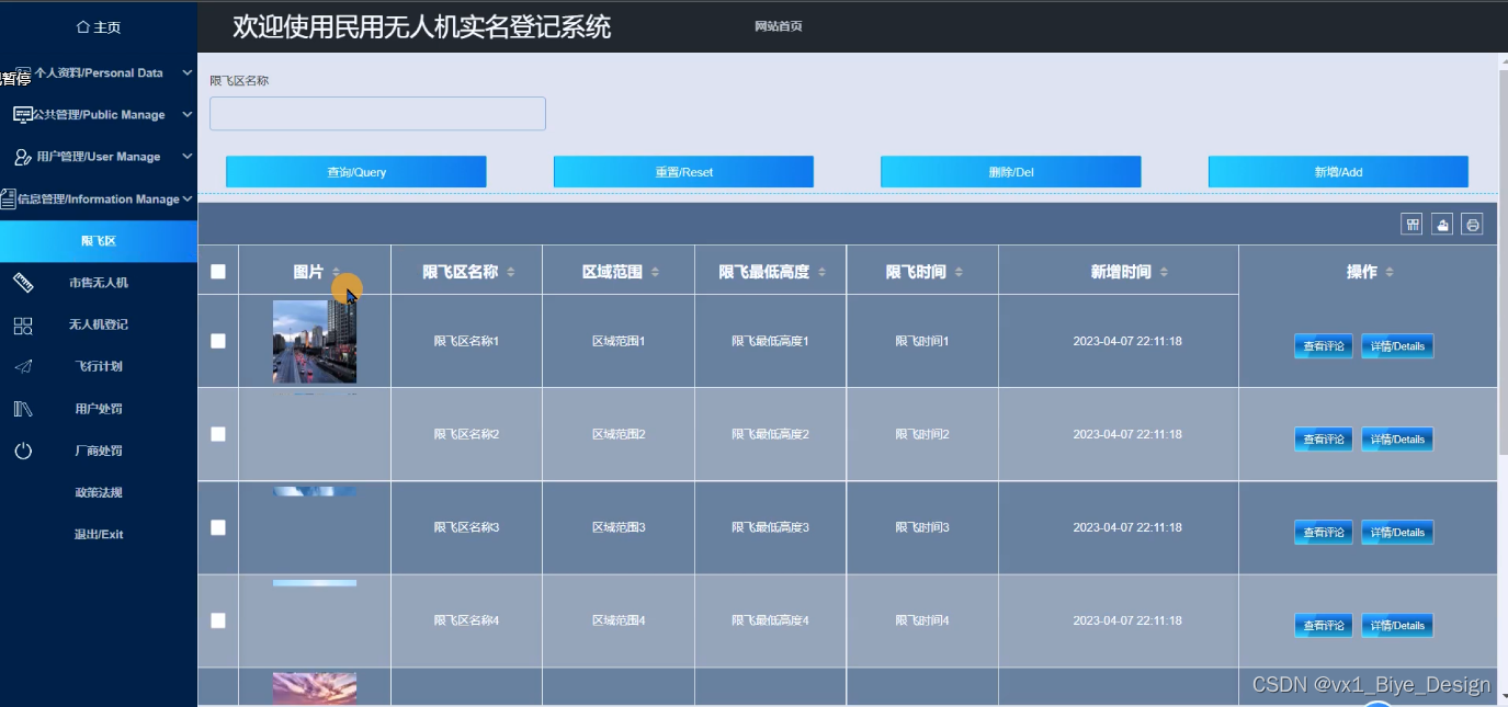 (5)限飞区:管理员点击“限飞区”会显示出所有的限飞区信息,支持输入图片或者限飞区名称对限飞区信息进行查询,如果想要添加新的限飞区信息,点击“添加”按钮,输入图片,限飞区名称、区域范围、限飞时间等信息,点击“提交”按钮就可以添加了,同时可以选择某一条限飞区信息,点击“删除”进行删除,也可以对用户提交的限飞区评论的信息进行管控;