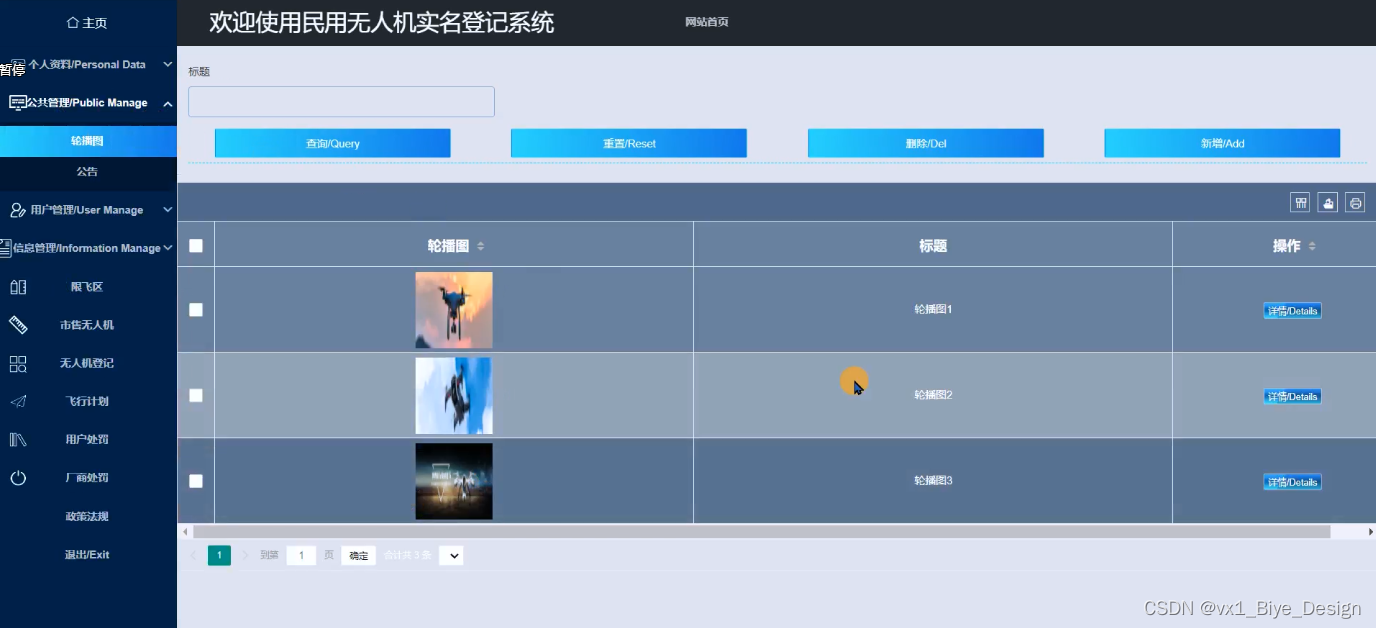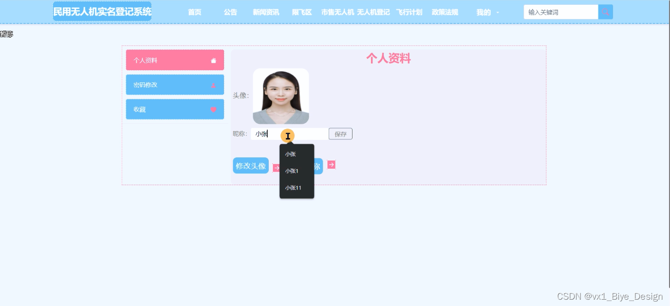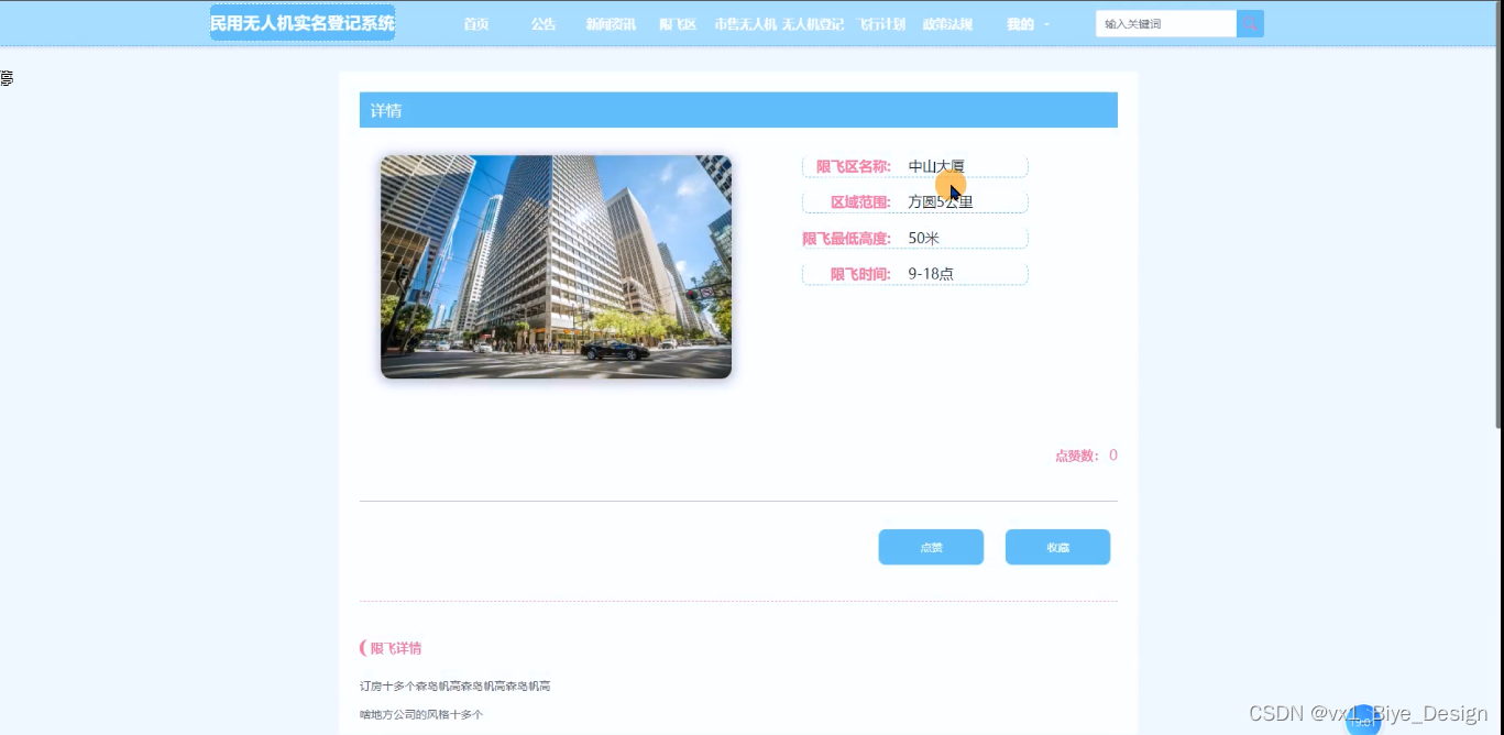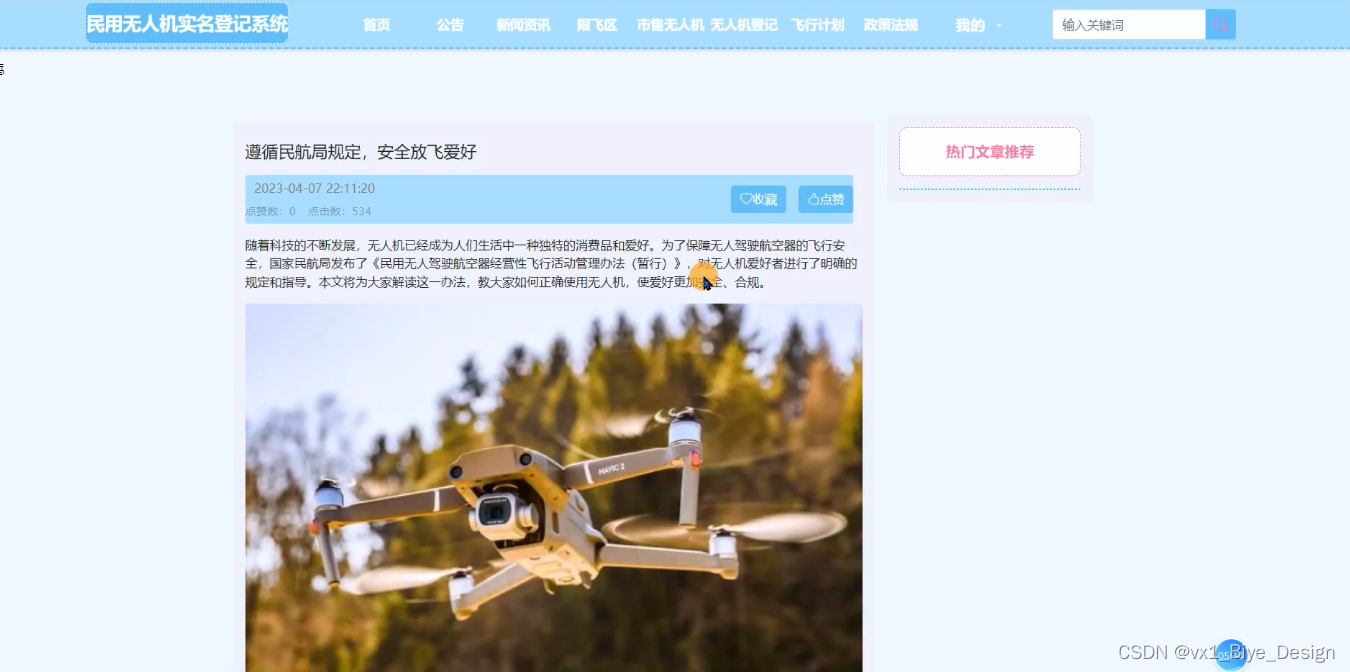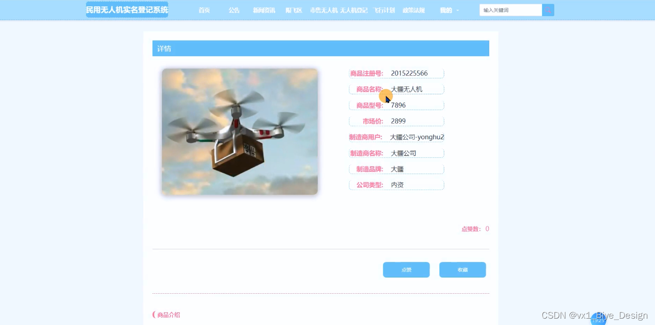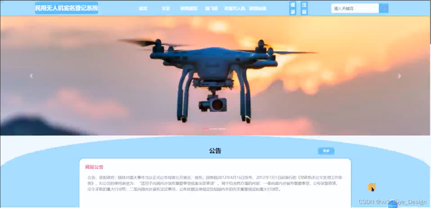 (1)首页信息:当用户进入本民用无人机实名登记系统的前台的时候,首先展示在眼前的是导航栏、公告、新闻资讯、限飞区、市售无人机、无人机登记、飞行计划、政策法规、我的(我的账户、我的收藏、个人中心)等信息,用户可以根据自己个人的需求进行查看;