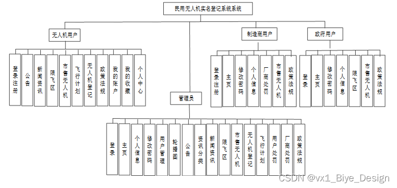 民用无人机实名登记系统整体的功能模块包括管理员+无人机持有人+制造商+政府四个模块,实现了对民用无人机实名登记系统相关信息的查询管理,系统功能模块如图所示。