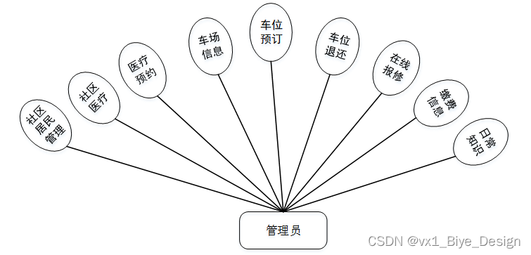 社区管理电子政务系统的设计基于现有的互联网,可以实现管理员:社区医疗、医疗预约、车场信息、车位预订、车位退还、在线报修、缴费信息、日常知识、知识分类等详细的了解及统计分析。根据系统功能需求建立的模块关系图如下图: