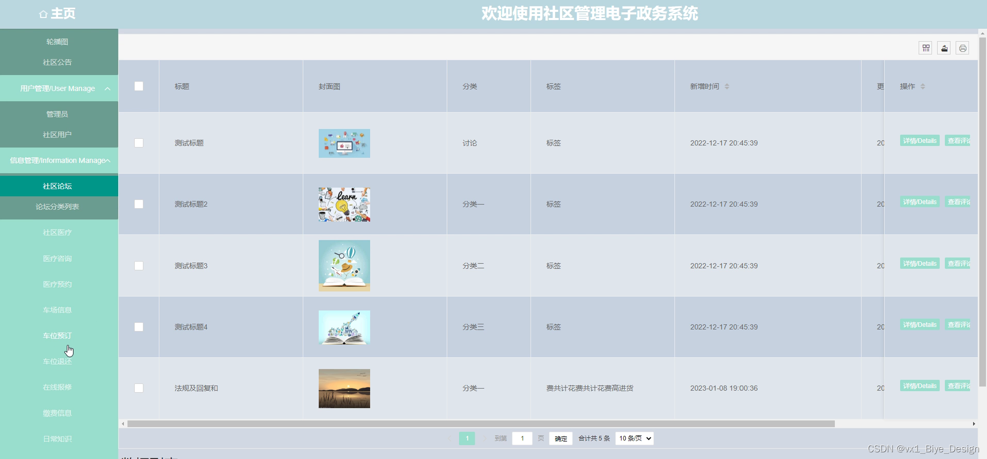 管理员登录进入社区管理电子政务系统后的主要功能是:后台首页、公共管理(公告栏、轮播图)用户管理(管理员、社区居民)信息管理(社区医疗管理、医疗预约管理、车场信息管理、车位预订、车位退还、在线报修、缴费信息、日常知识)等信息。如图5-7所示。