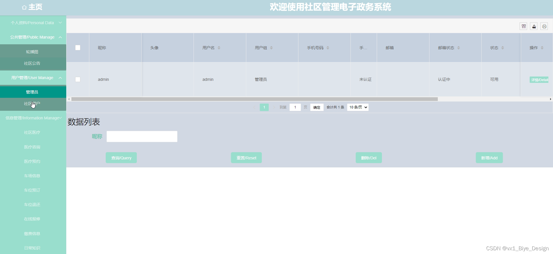 社区管理电子政务系统中的管理人员是可以对前台注册的居民用户信息进行管理。界面如下图5-8所示。
