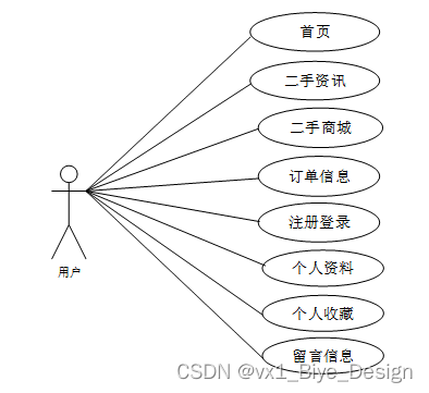 通过2.3功能的分析,得出了本二手商城的用例图: