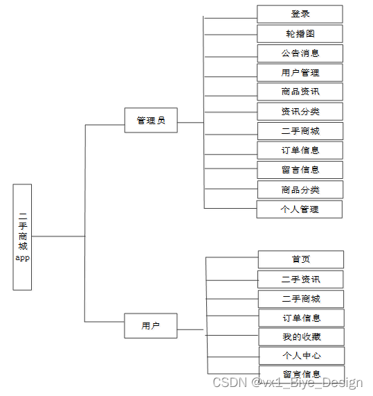 按照二手商城的角色,我划分为了用户管理模块和管理员管理模块这两大部分。