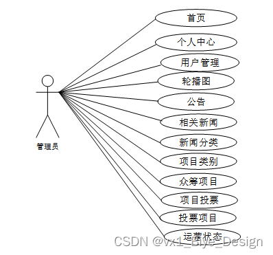 The crowdfunding platform for college students mainly consists of administrators, users, and fundraising users. Its implementation functions include: homepage, personal information (personal information, password modification), public management (broadcast images, announcements), user management (administrators, ordinary users, fundraising users), information management (related news, news classification), project categories, crowdfunding projects, project voting, investment projects, operational status, and other functions. The main purpose of administrators in the system is to store and manage various types of information safely and effectively. They can also manage, update, and maintain the system, and have corresponding operation permissions for the backend.