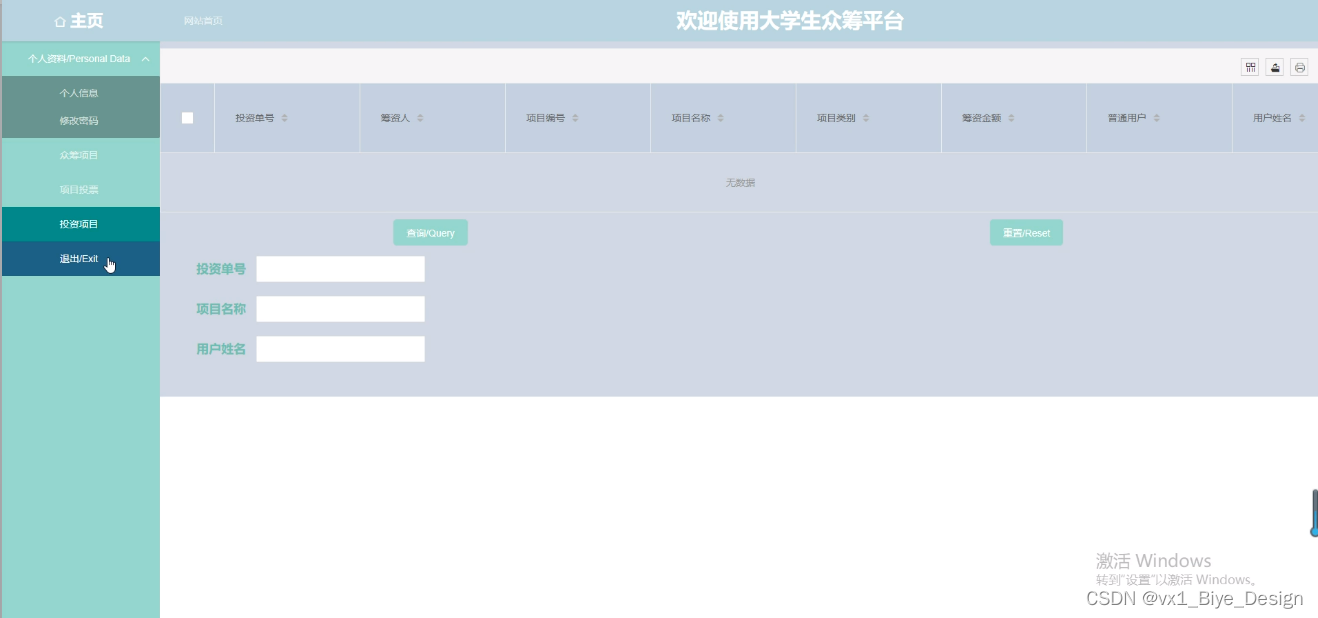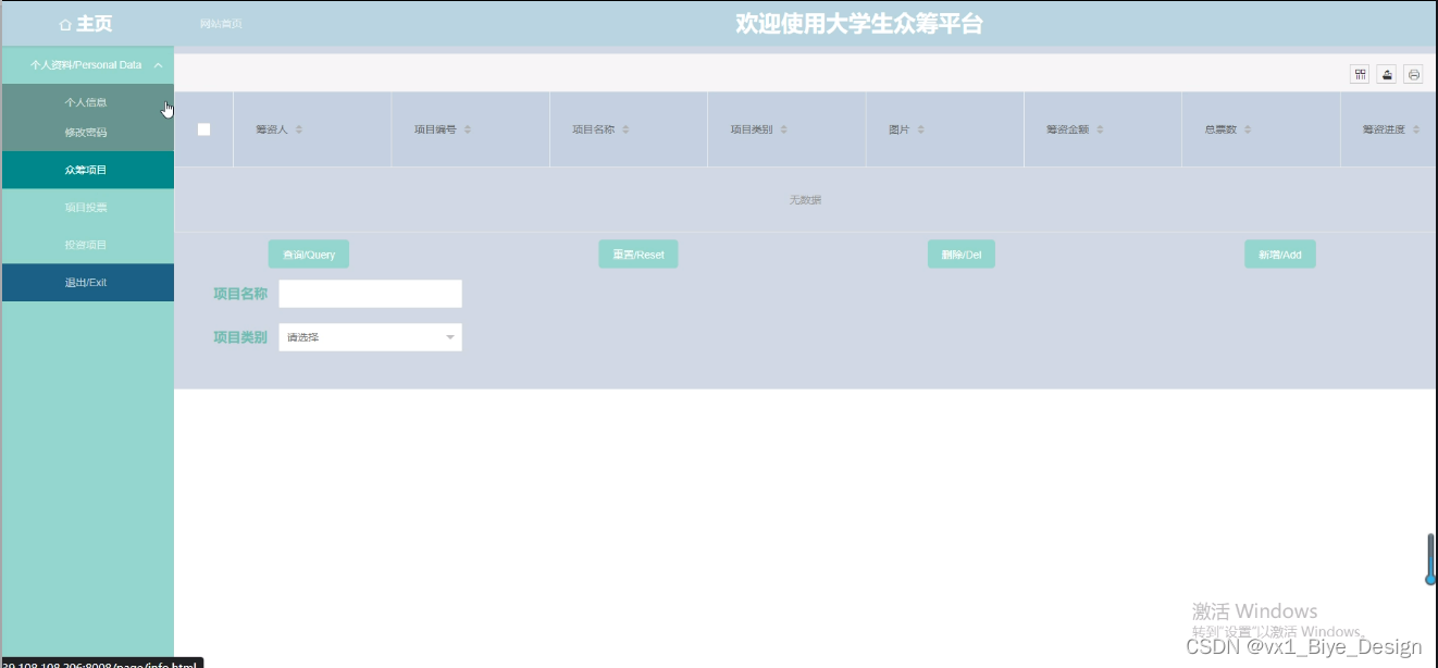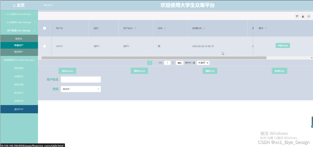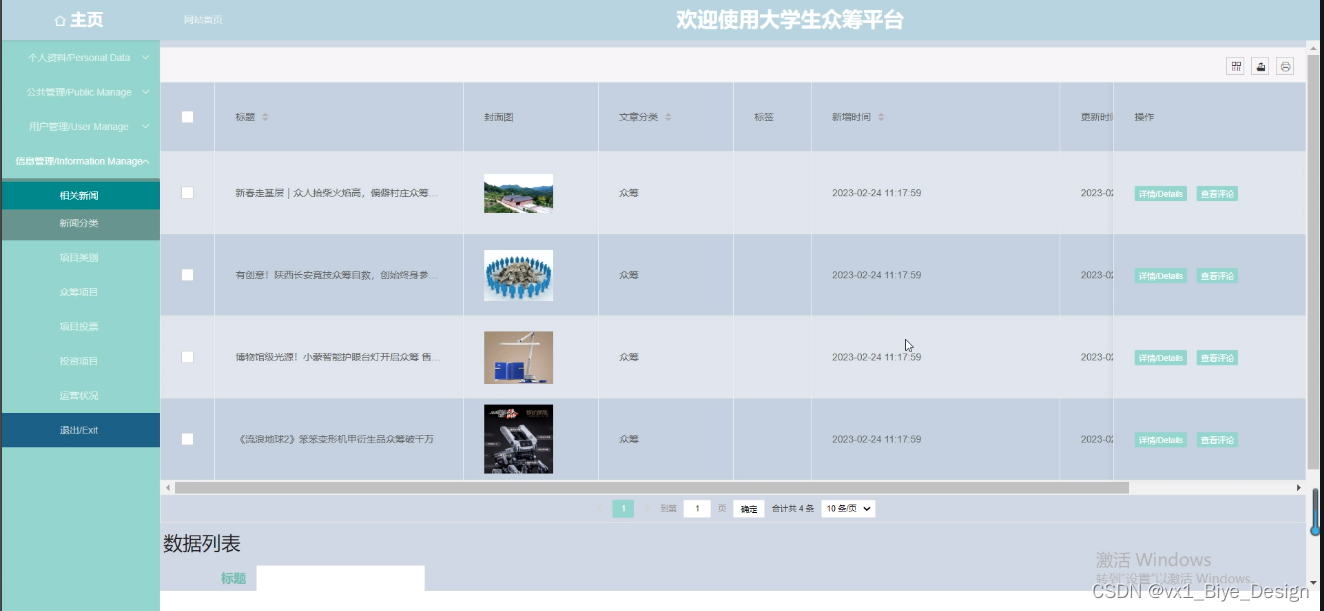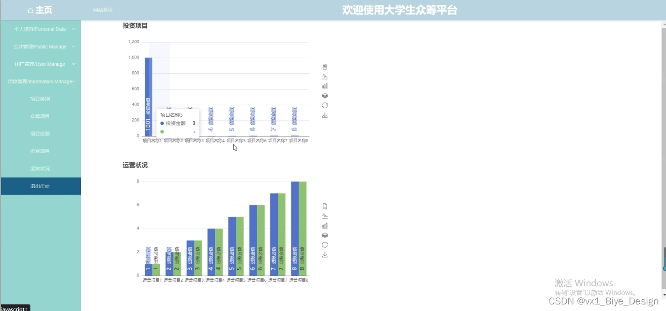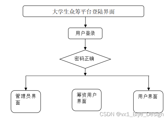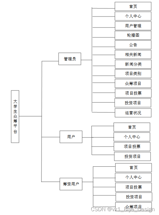 大学生众筹平台,主要的模块包括管理员和用户及筹资用户,实现功能包括:首页、个人资料(个人信息、修改密码)、公共管理(轮播图、公告)、用户管理(管理员、普通用户、筹资用户)、信息管理(相关新闻、新闻分类)、项目类别、众筹项目、项目投票、投资项目、运营状况等功能。系统中管理员主要是为了安全有效地存储和管理各类信息,还可以对系统进行管理与更新维护等操作,并且对后台有相应的操作权限。