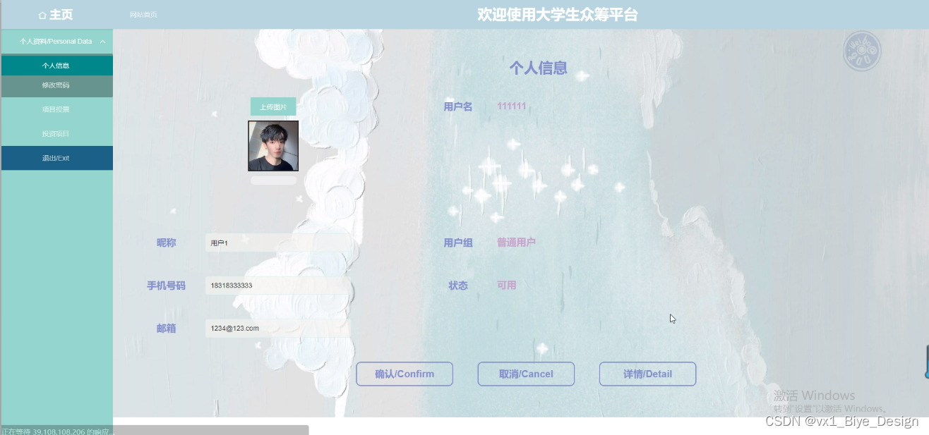 用户后台功能界面,在用户后台功能界面图可查看管理首页、个人资料(个人信息、修改密码)、项目投票、投资项目等功能,如图5-6所示。