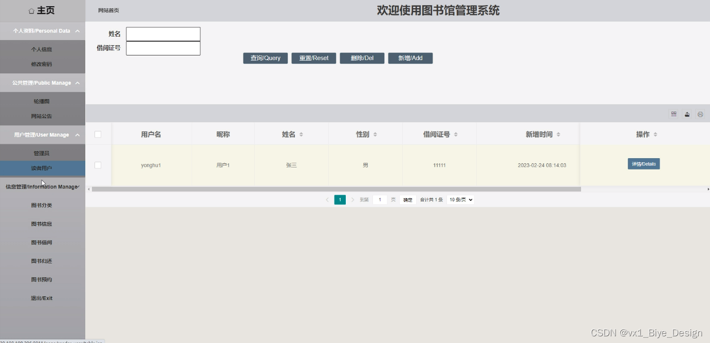 用户管理,在读者管理页面可以对索引、用户名、昵称、姓名、性别、借阅证号等信息进行详情、修改或删除等操作,如图5-9所示。
