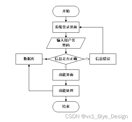 用户打开并进入系统后,会先显示登录界面,输入正确的用户名和密码,系统自动检测信息,若信息无误,则用户会进入系统功能界面,进行操作,否则会提示错误无法登录,操作流程如图3-3所示。