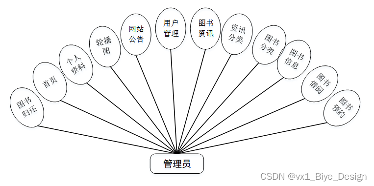 系统中的核心用户是系统管理员,管理员登录后,通过管理员菜单来管理后台系统。主要功能有:首页、个人资料(个人信息、修改密码)、公共管理(轮播图、网站公告)、用户管理(管理员、读者用户)、信息管理(图书资讯、资讯分类)、图书分类、图书信息、图书借阅、图书归还、图书预约等功能。服务端用例如图3-7所示。