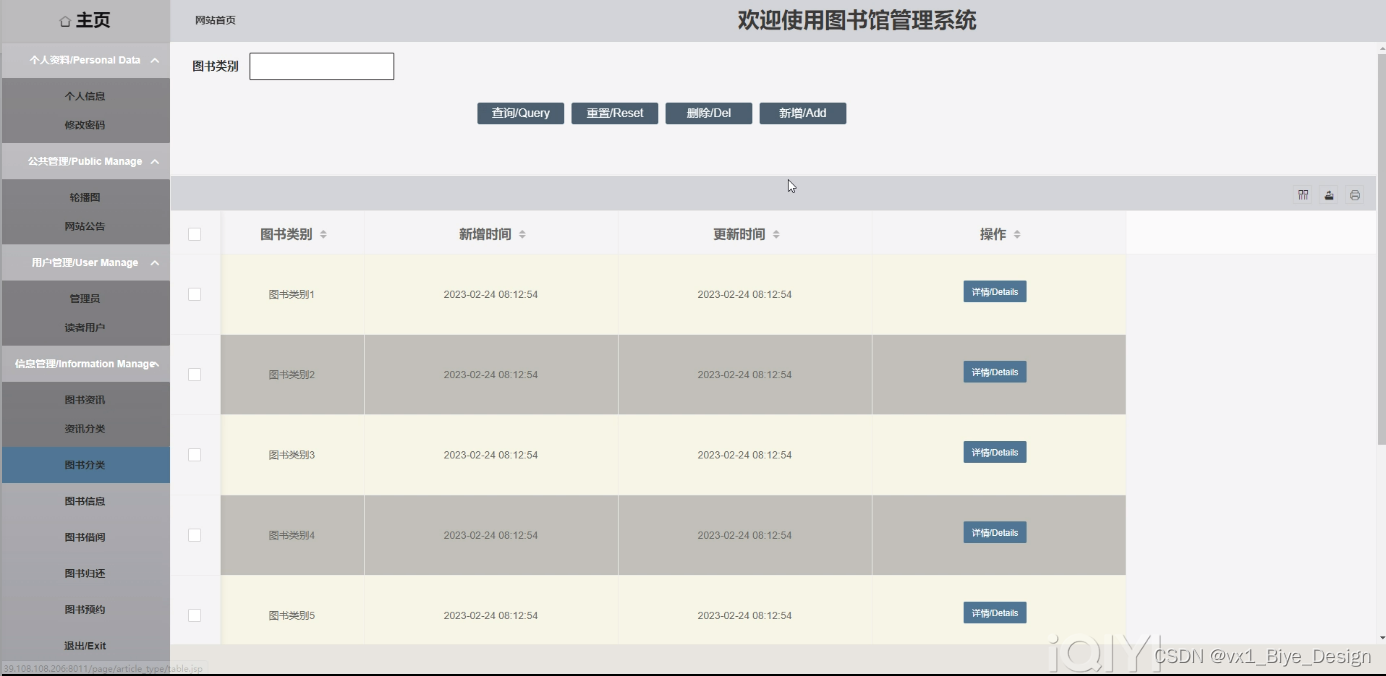 图书分类管理,在图书分类管理页面可以对索引、图书分类等信息进行详情、修改或删除等操作,如图5-12所示。