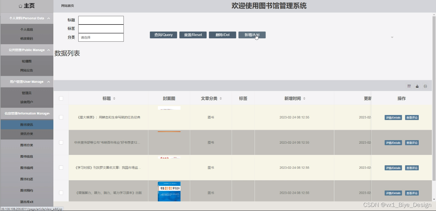 图书资讯管理,在图书资讯管理页面可以对索引、标题、封面图、文章分类标签、描述等信息进行详情查看评论、修改或删除等操作,如图5-11所示。