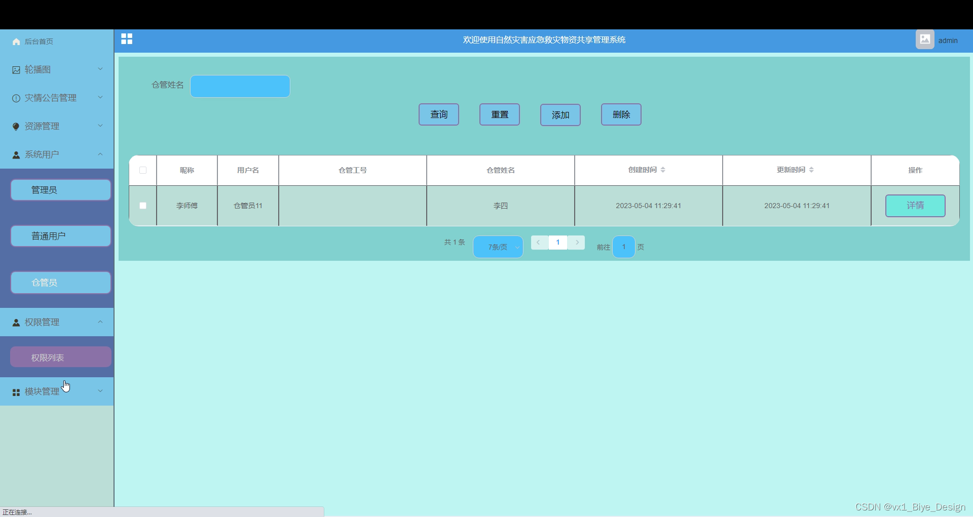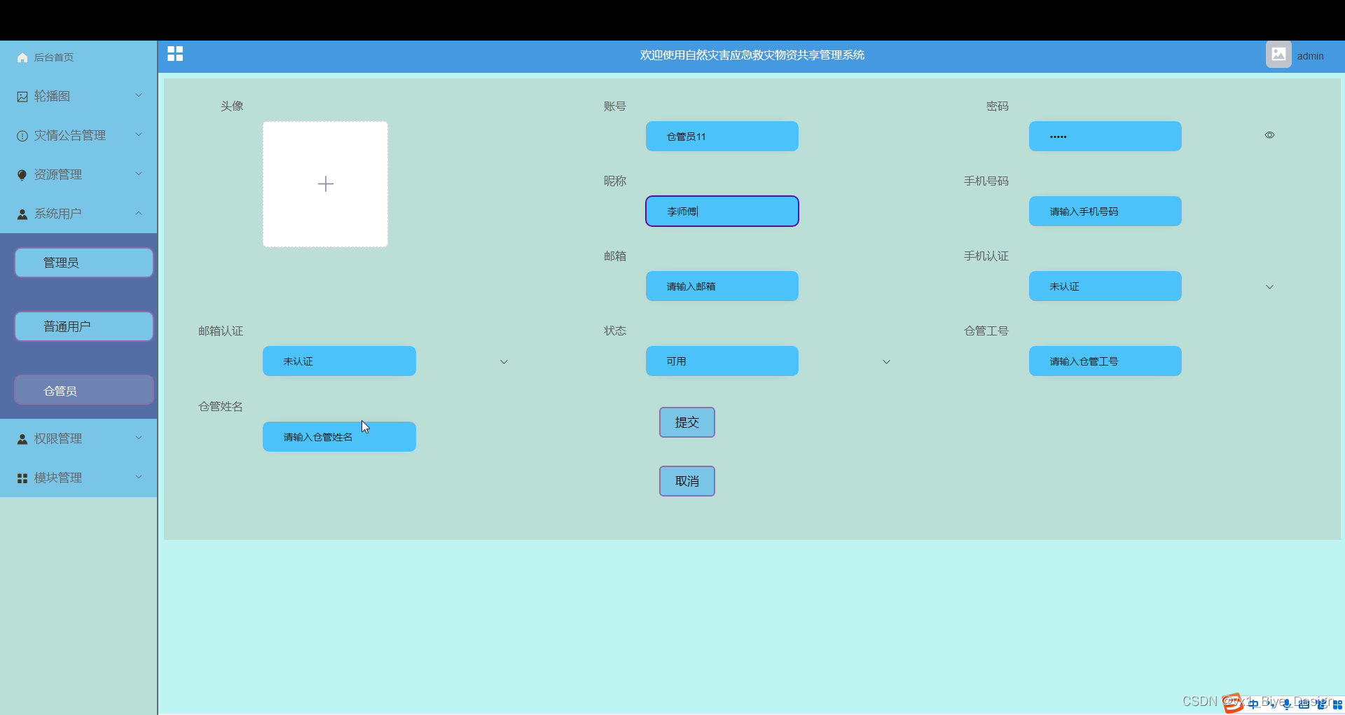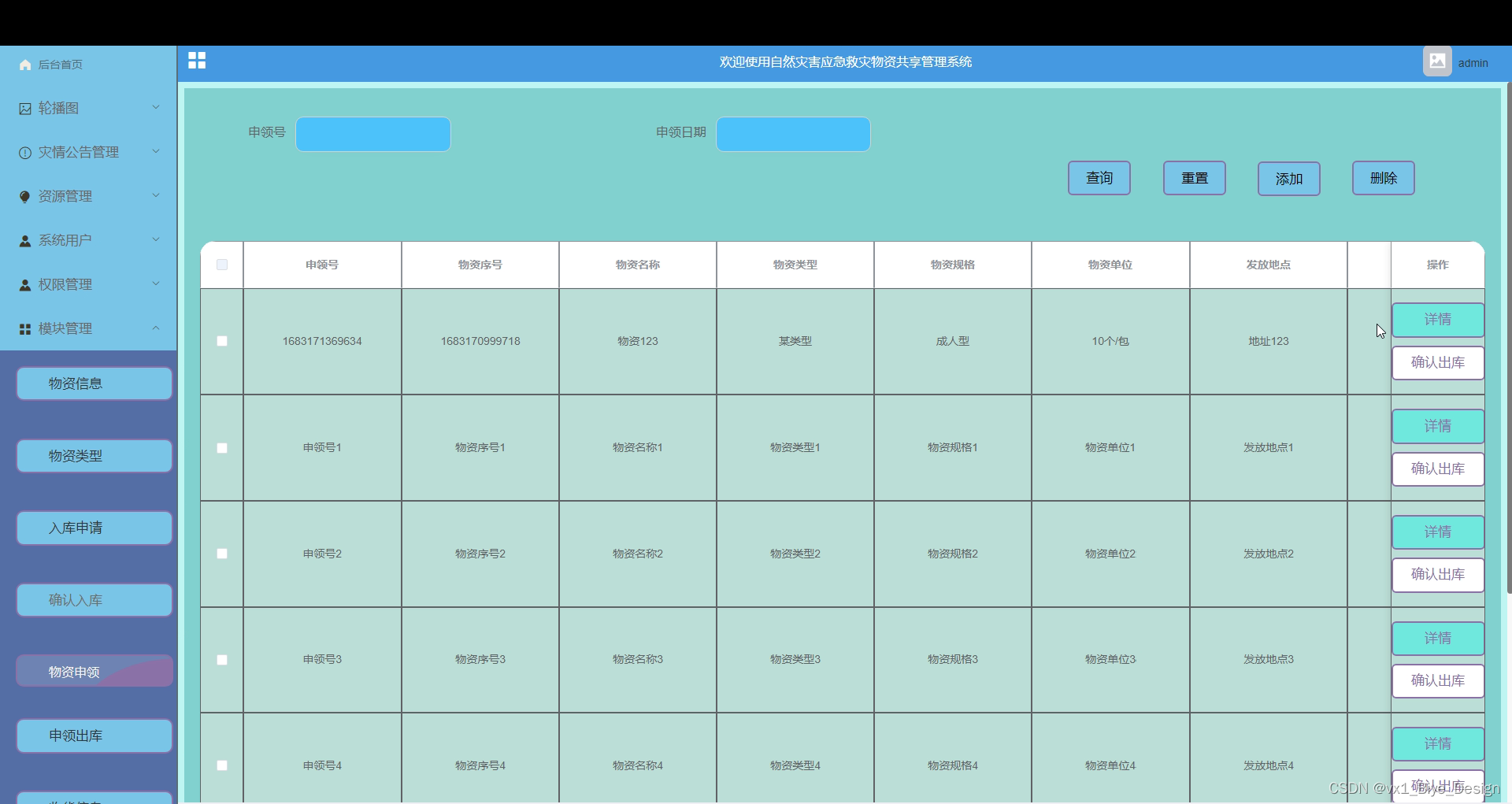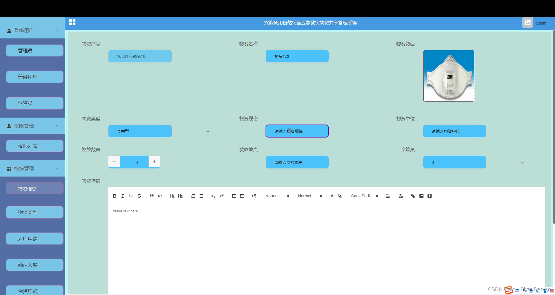 3、功能的完善性:拥有首页,轮播图,灾情公告管理,资源管理(急救知识,知识分类),系统用户(管理员,普通用户,仓管员),权限管理,模块管理(物资信息,物资类型,入库申请,确认入库,物资申领,申领出库,收货信息,配送反馈,调配申请,调配出库)等模块的修改维护操作。