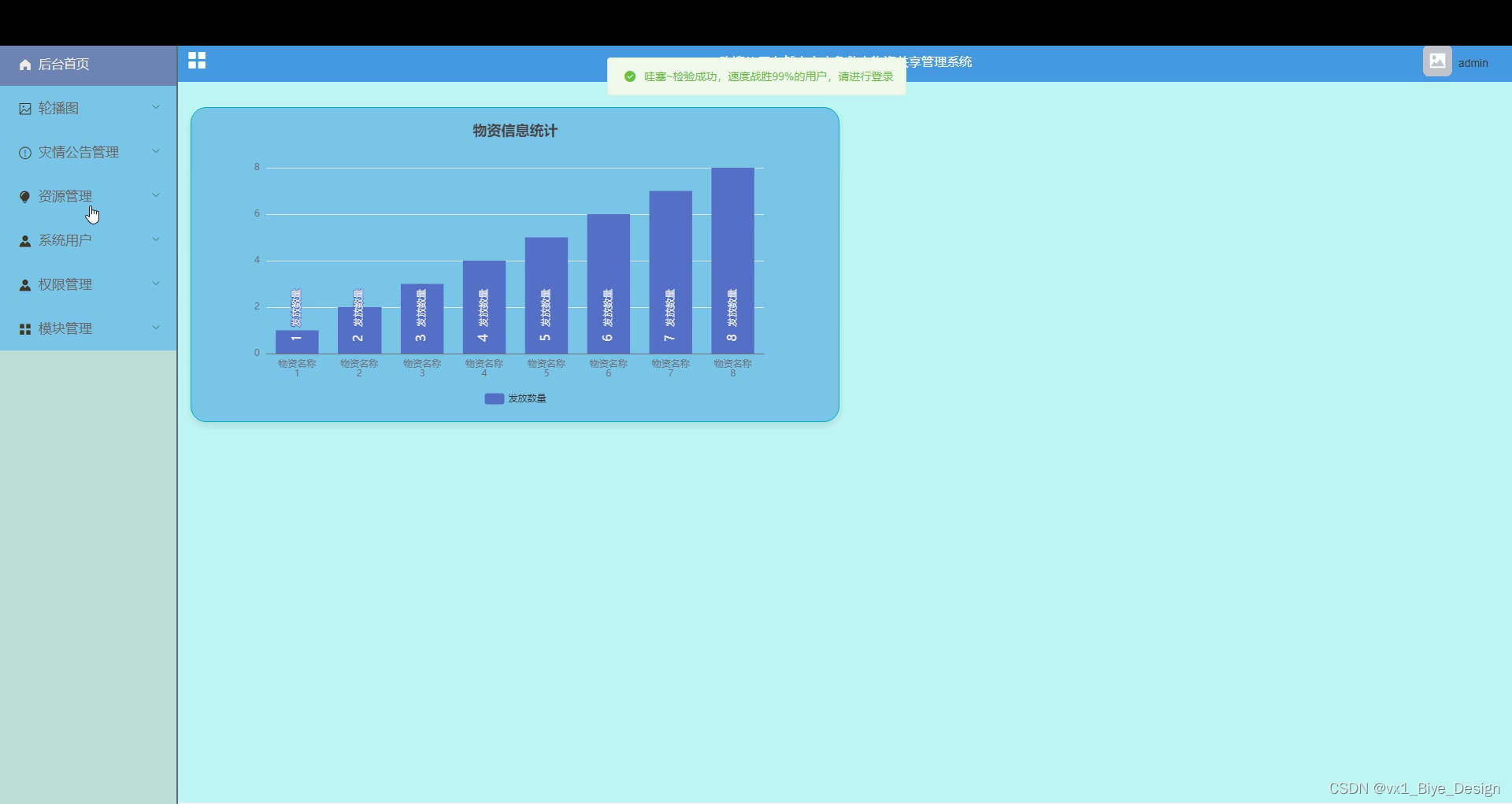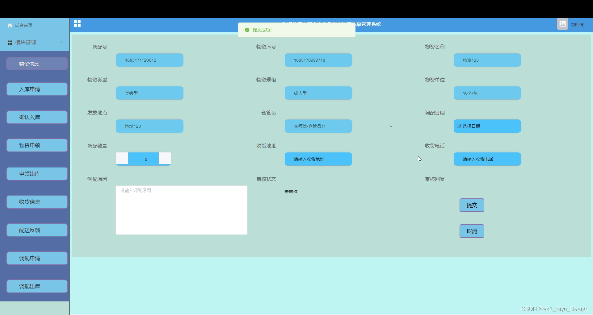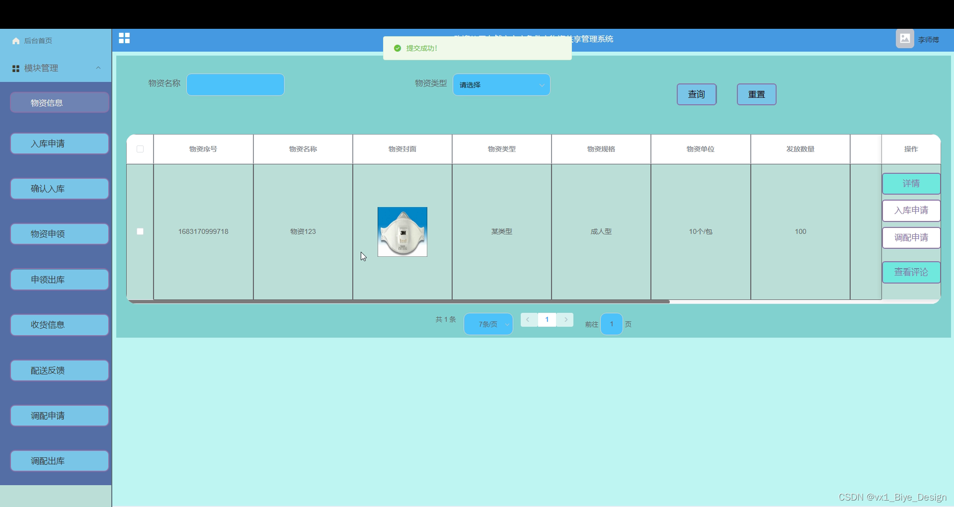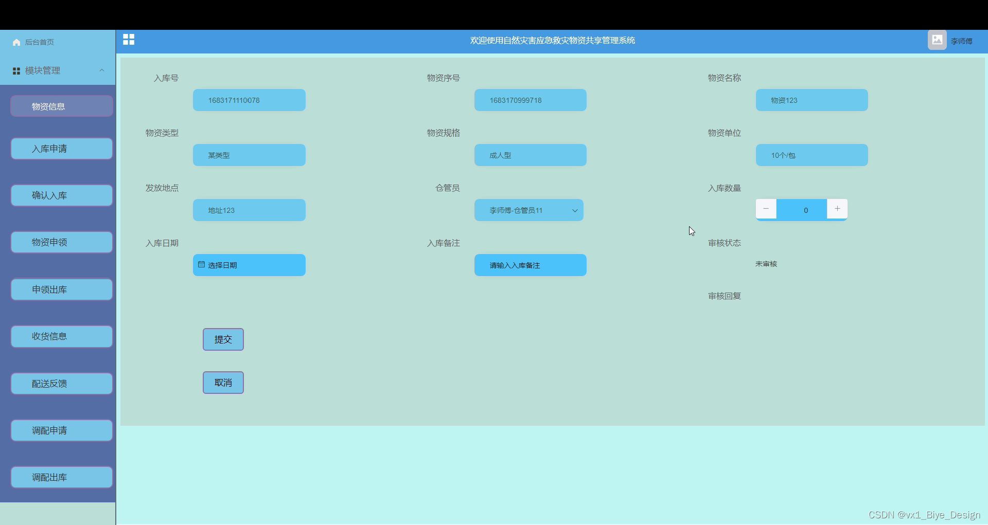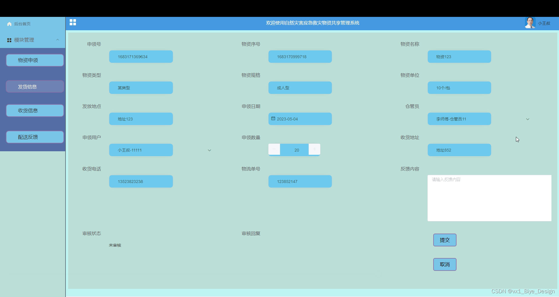 3、功能的完善性:拥有首页,轮播图,灾情公告管理,资源管理(急救知识,知识分类),系统用户(管理员,普通用户,仓管员),权限管理,模块管理(物资信息,物资类型,入库申请,确认入库,物资申领,申领出库,收货信息,配送反馈,调配申请,调配出库)等模块的修改维护操作。