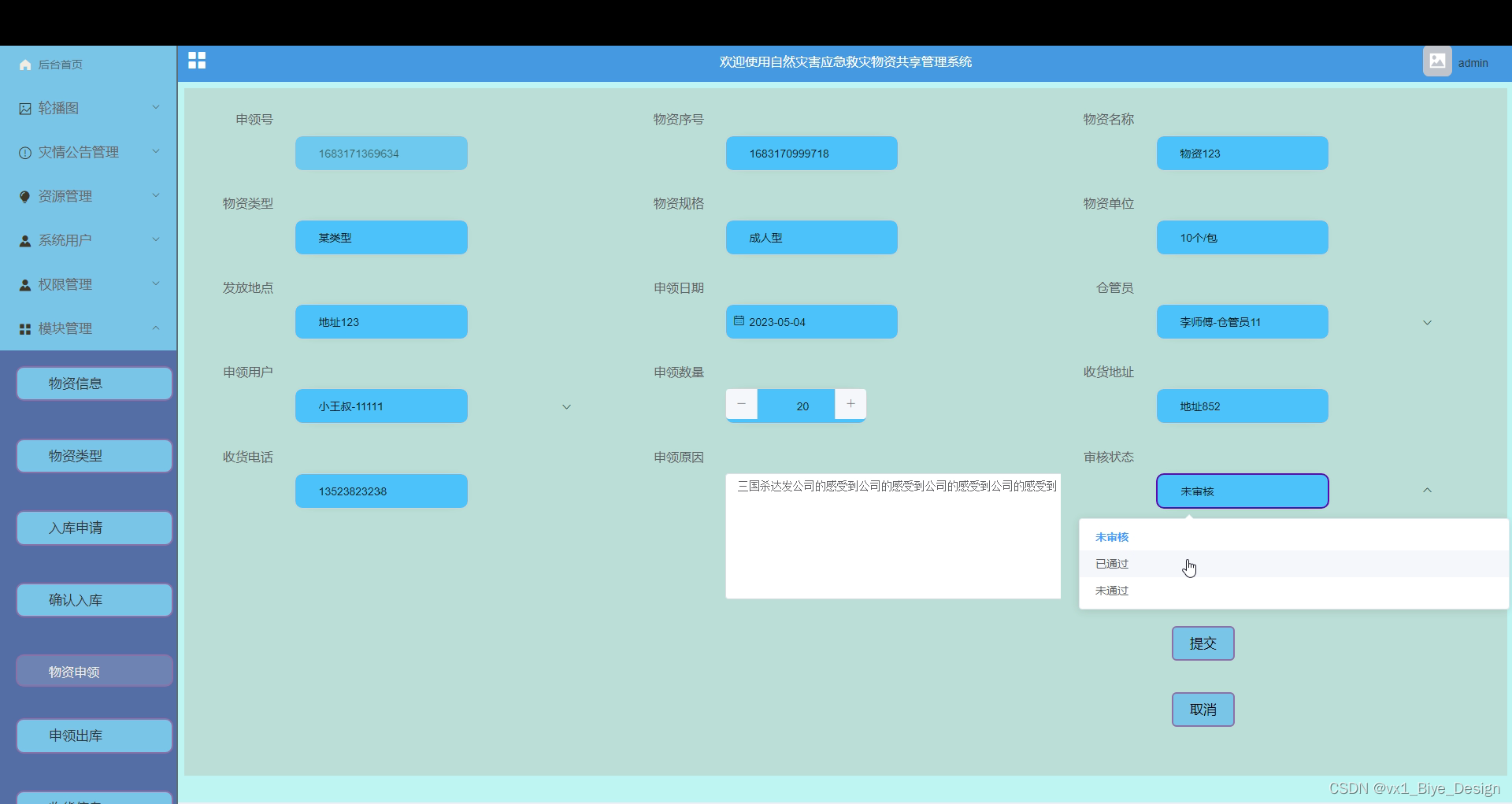 自然灾害应急救灾物资共享管理系统主要是为了方便用户在特殊时期在线完成物资申请,也方便仓管员,管理员等更好的管理物、共享物资,以及管理员更好的全流程引导和管理,更好存储所有数据信息及快速方便的检索功能。对系统的各个模块是通过许多今天的发达系统做出合理的分析来确定考虑用户的可操作性,遵循开发的系统优化的原则,经过全面的调查和研究。