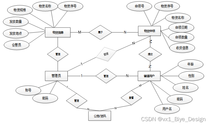 通过自然灾害应急救灾物资共享管理系统的功能进行规划分成几个实体信息,实体信息将通过ER图进行说明,本系统的主要实体图如下: