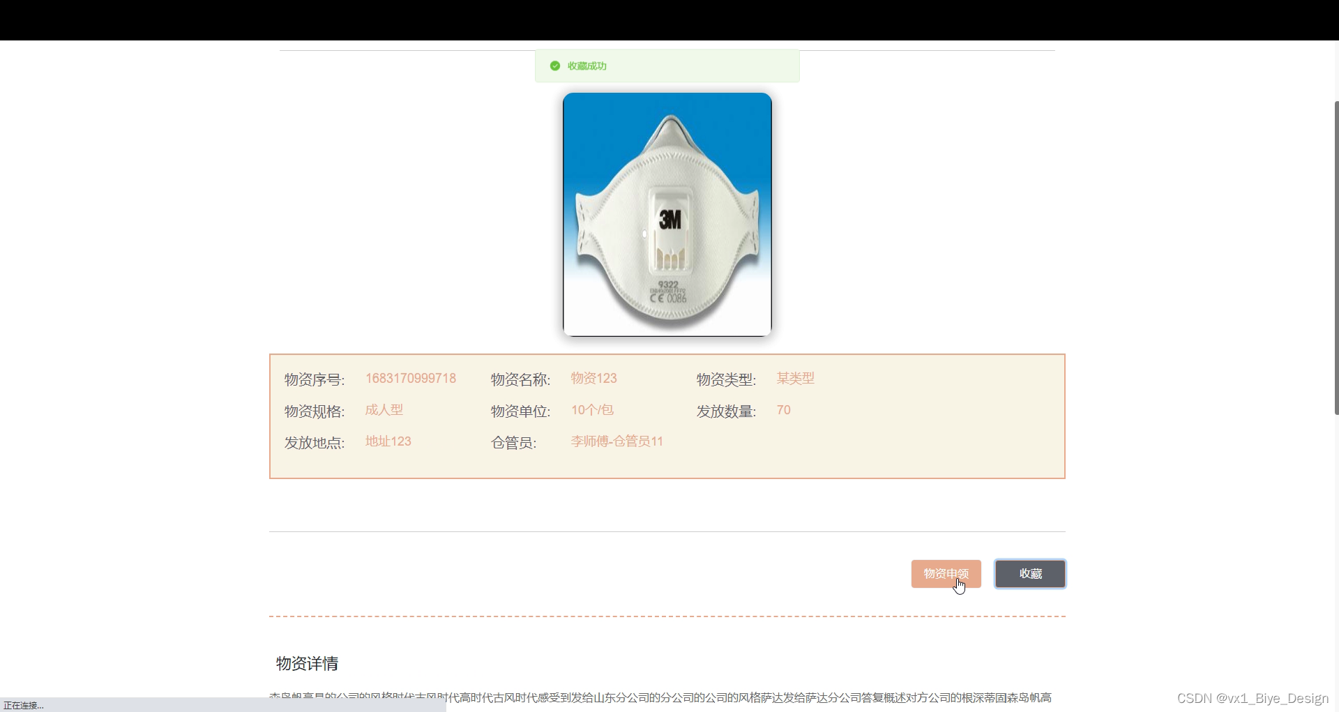 共享物资,普通用户在此页面查看物资信息详情,包括物资序号,物资名称,封图,类型,规格,物资单位,发放数量,发放地点,仓管员等信息,可以收藏,评论,申领等操作,如下图所示。