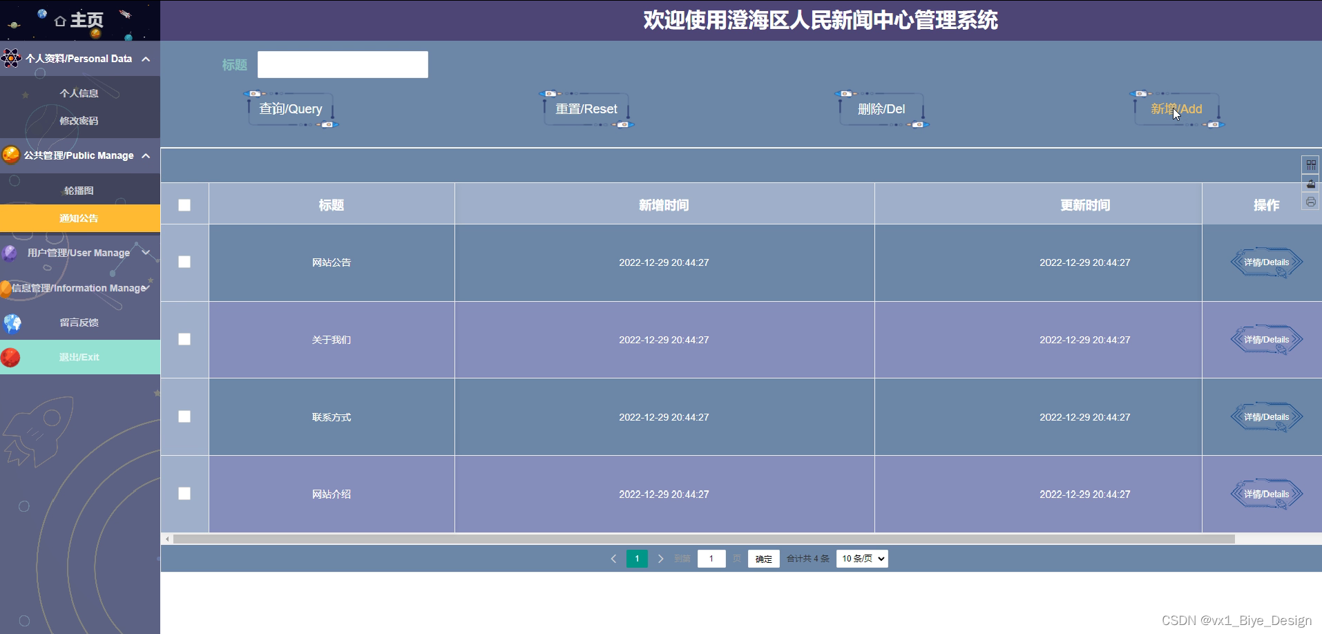 通知公告,管理员在此页面可以查看公告标题,新增时间,更新时间等信息,并可根据需要进行查询,重置,删除,新增等操作,如图5-4所示。