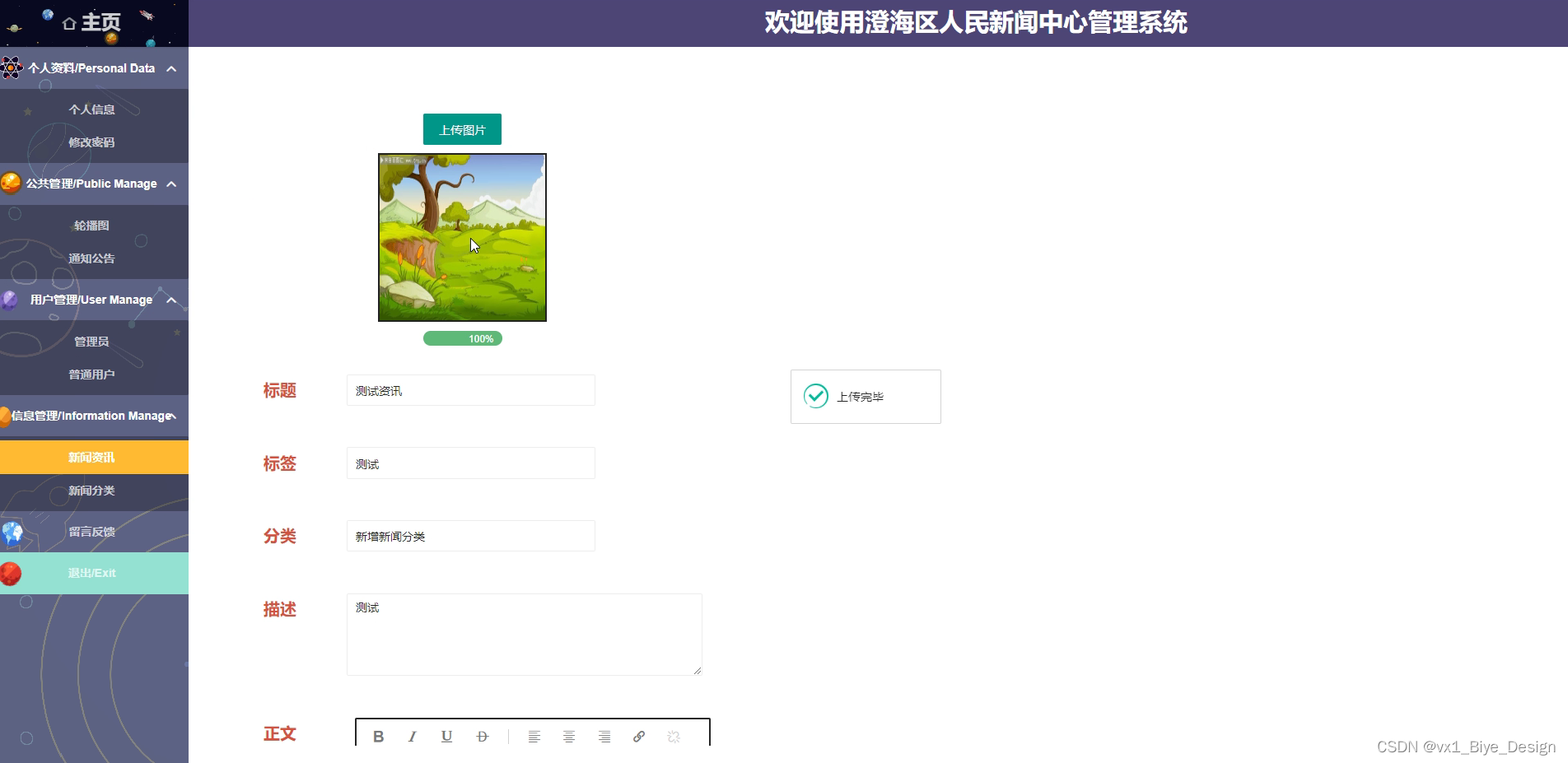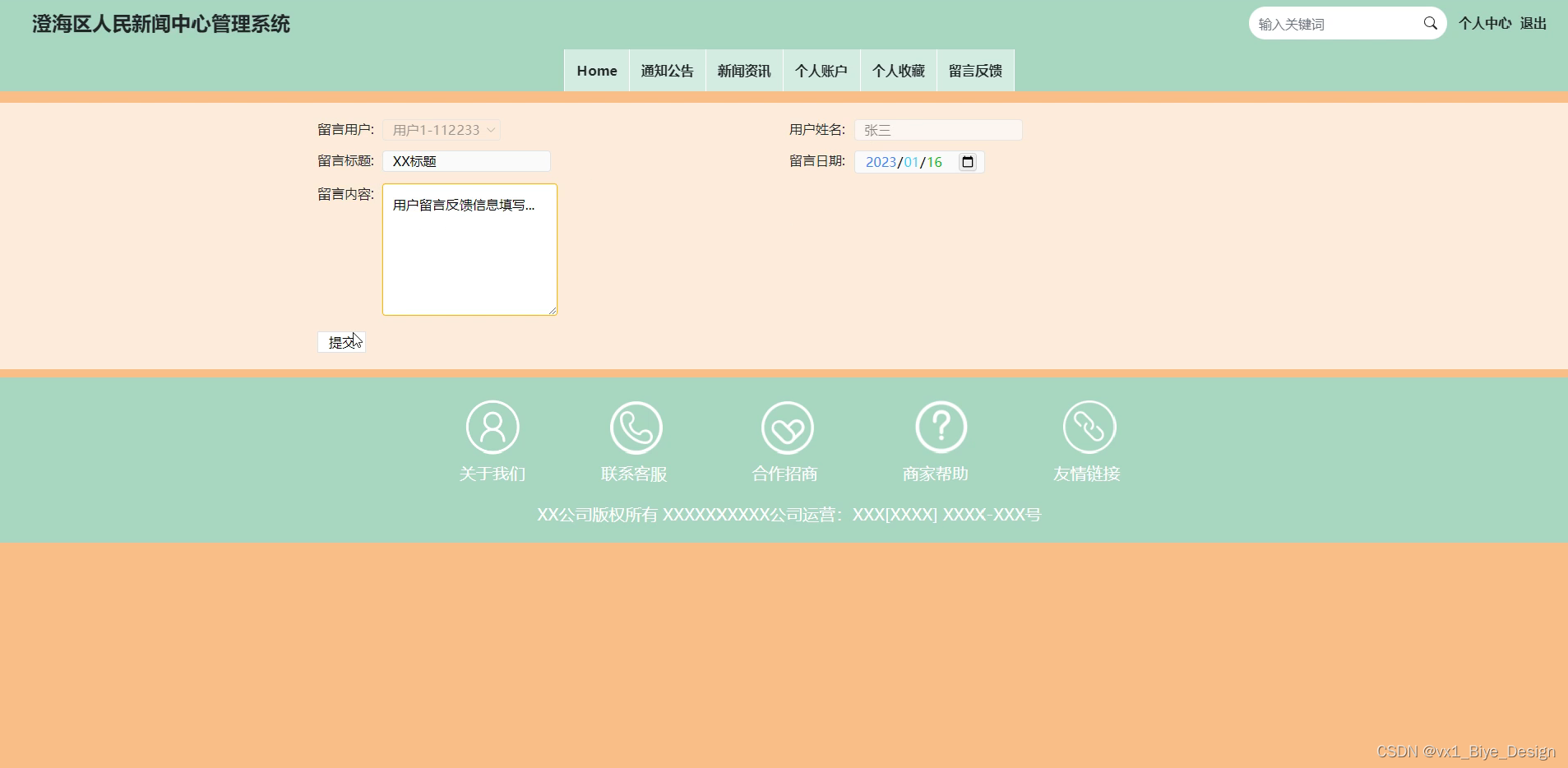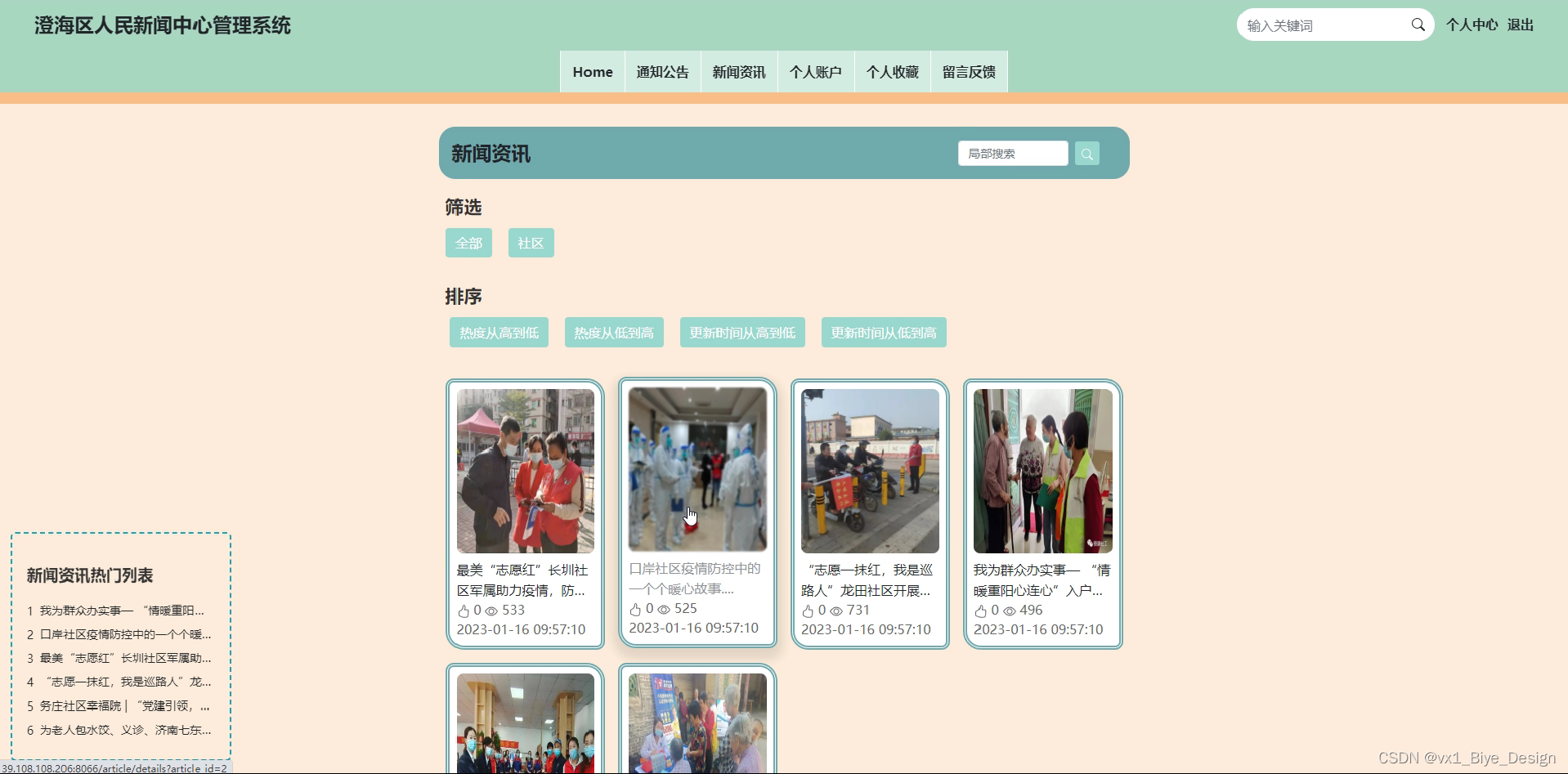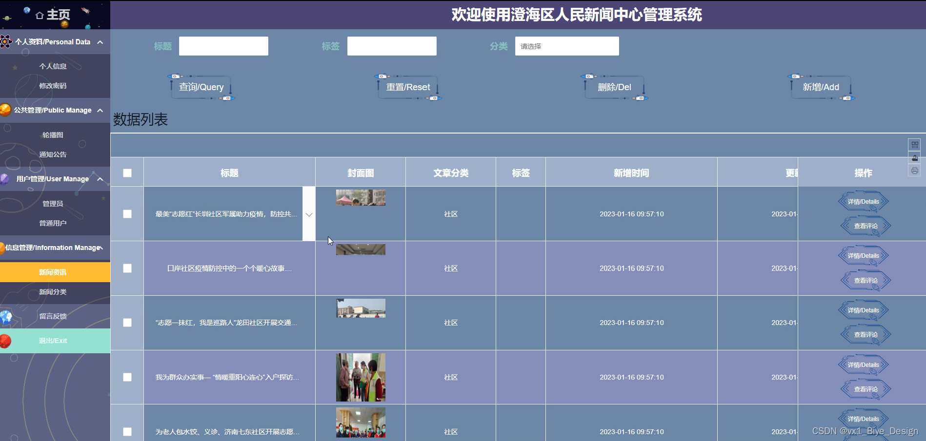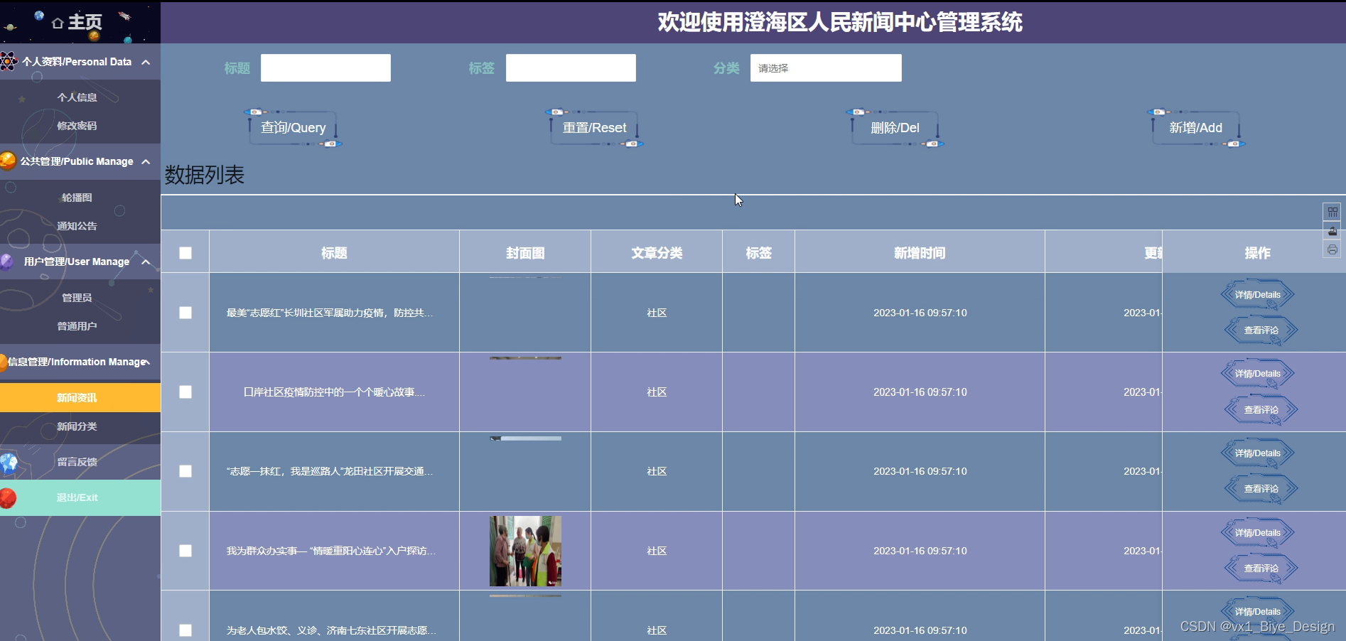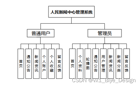 (1)功能要求:可以管理主页,个人资料,公共管理(轮播图,通知公告),用户管理(管理员,普通用户),信息管理(新闻资讯,新闻分类),留言反馈等功能模块。