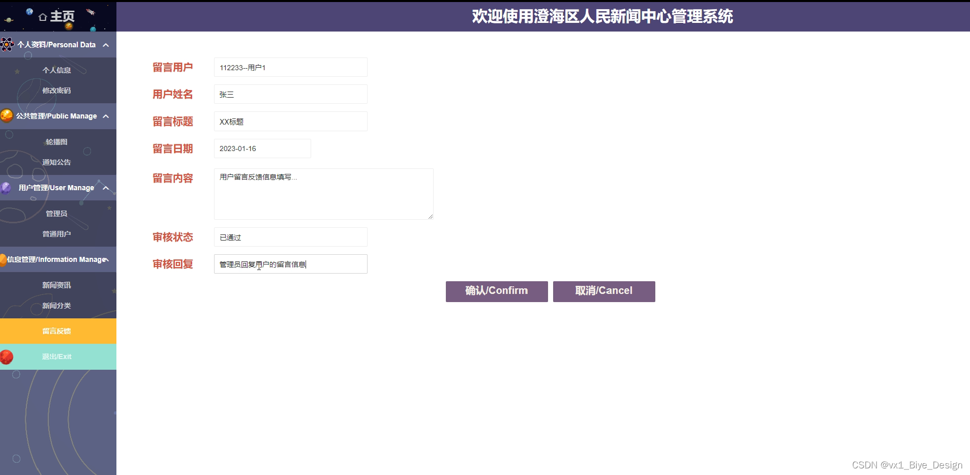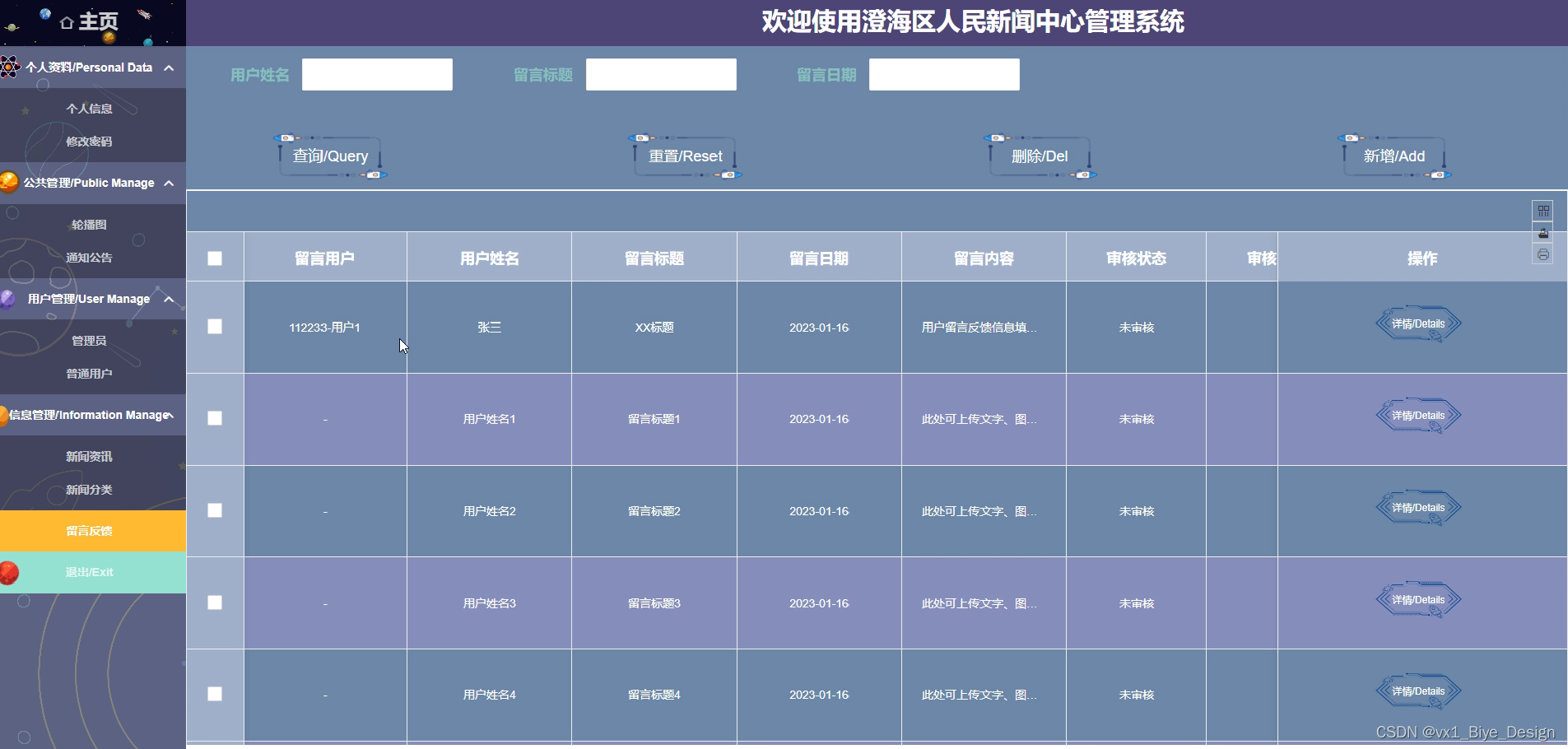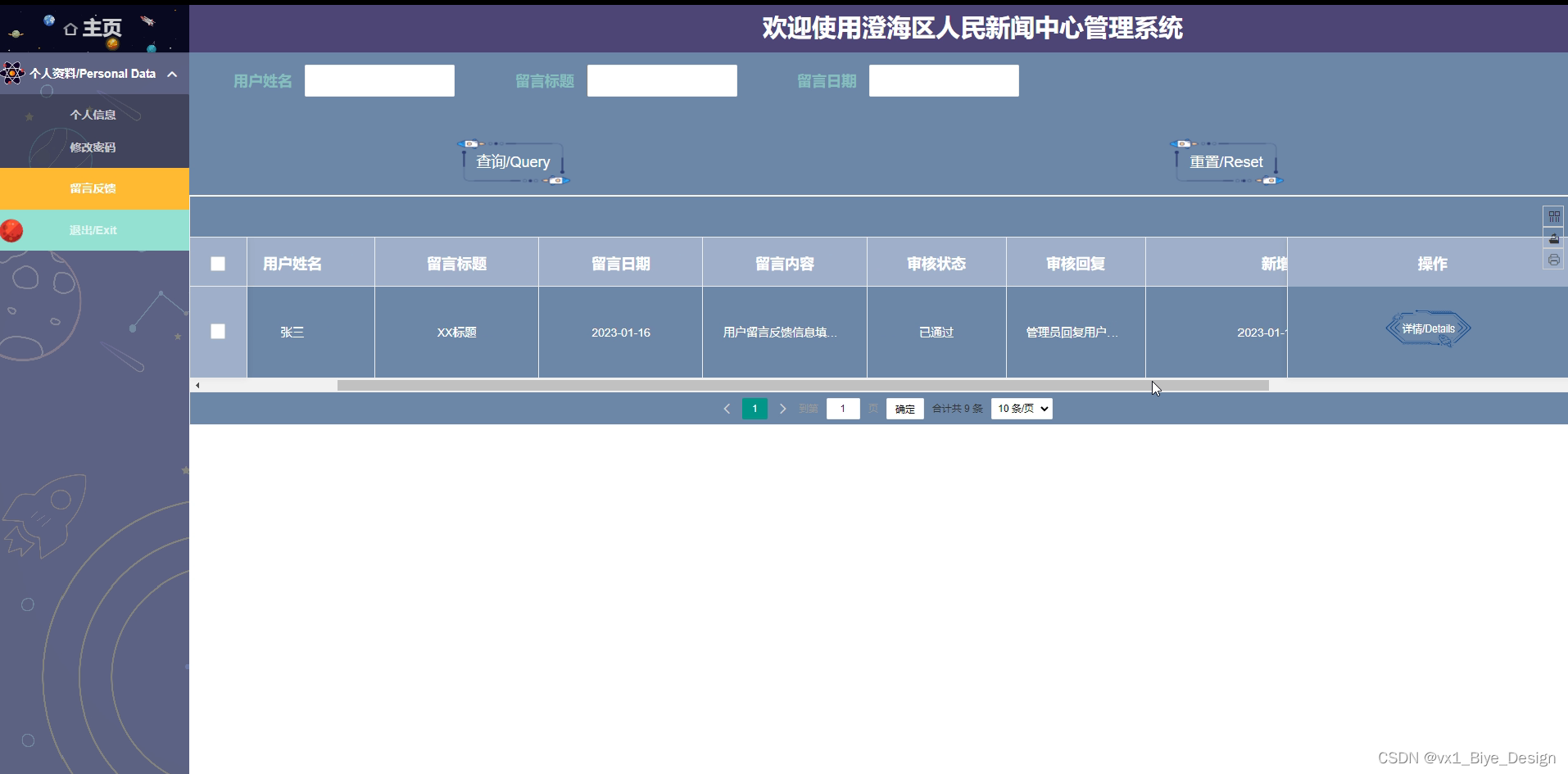 留言反馈管理,管理员在此页面可以查看留言用户,姓名,标题,日期,留言内容信息,并可根据需要进行审核回复,查询,重置,删除,新增等操作,如图5-9,5-10所示。