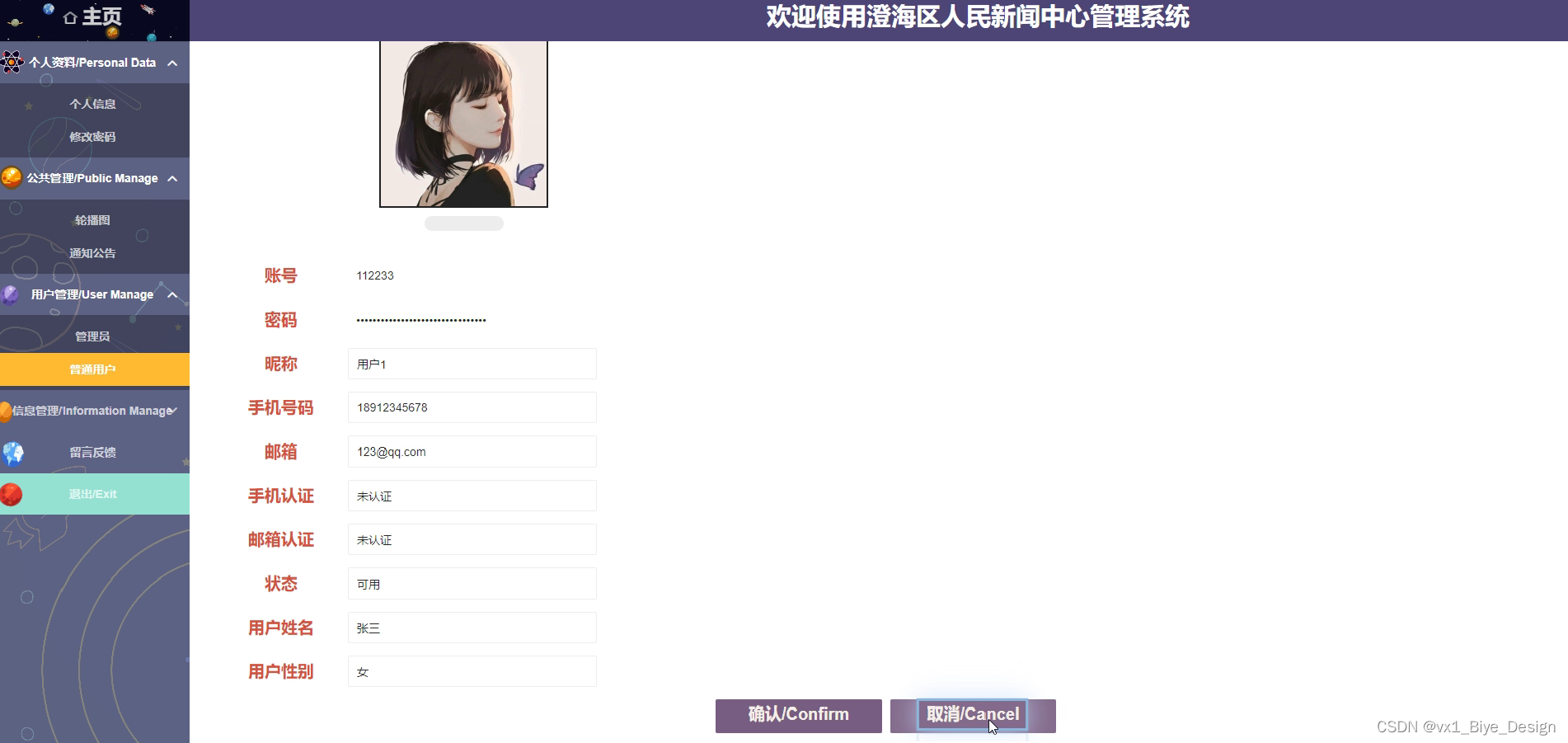 3、功能的完善性:可以管理主页,个人资料,公共管理(轮播图,通知公告),用户管理(管理员,普通用户),信息管理(新闻资讯,新闻分类),留言反馈等模块的修改维护操作。