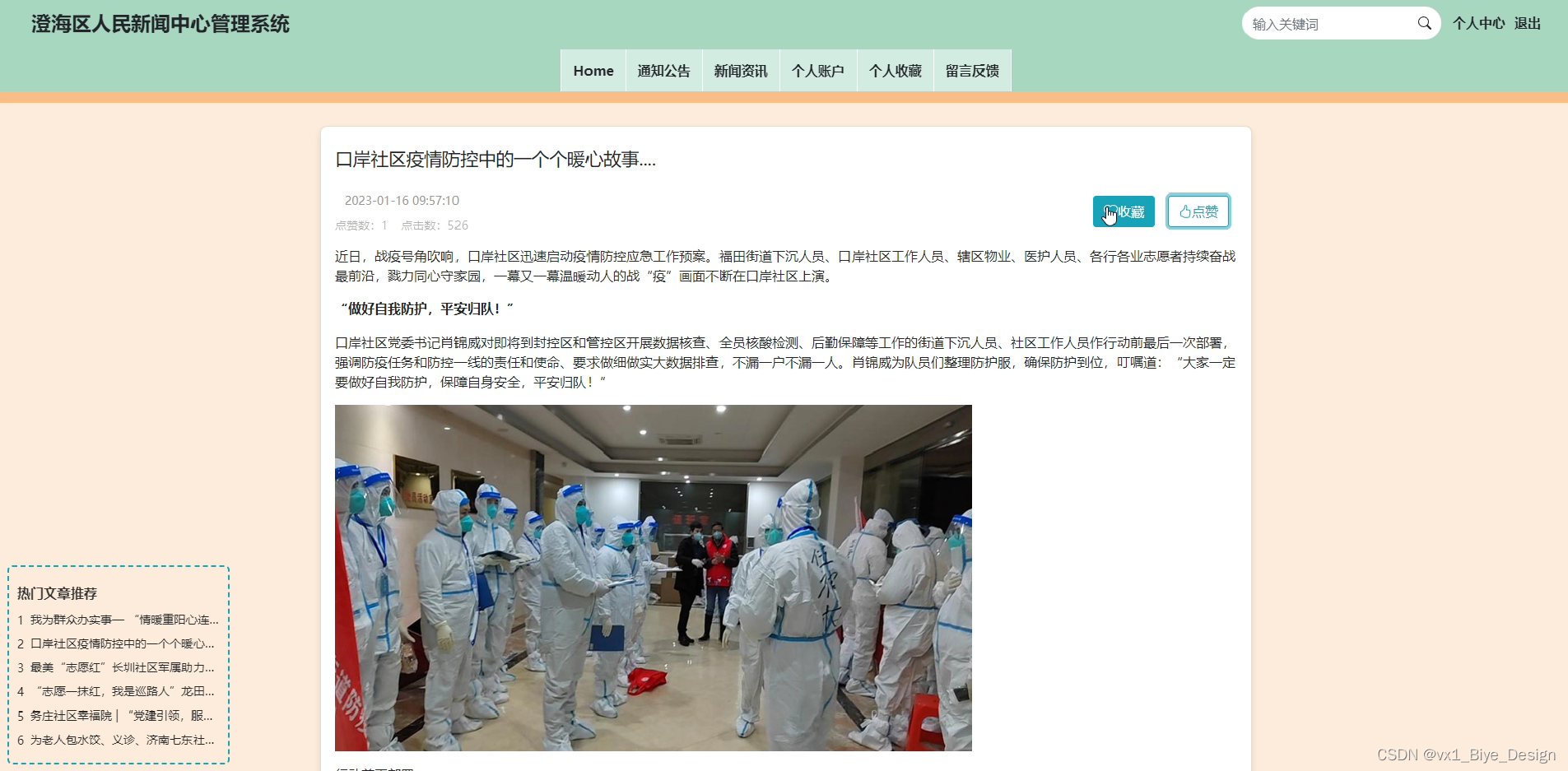 新闻资讯,在此页面可以查看推荐的资讯信息,并通过筛选,排序等操作进行资讯信息查询,进入资讯详情界面后可以进行收藏,点赞,评论等操作,如图5-13,5-14所示。