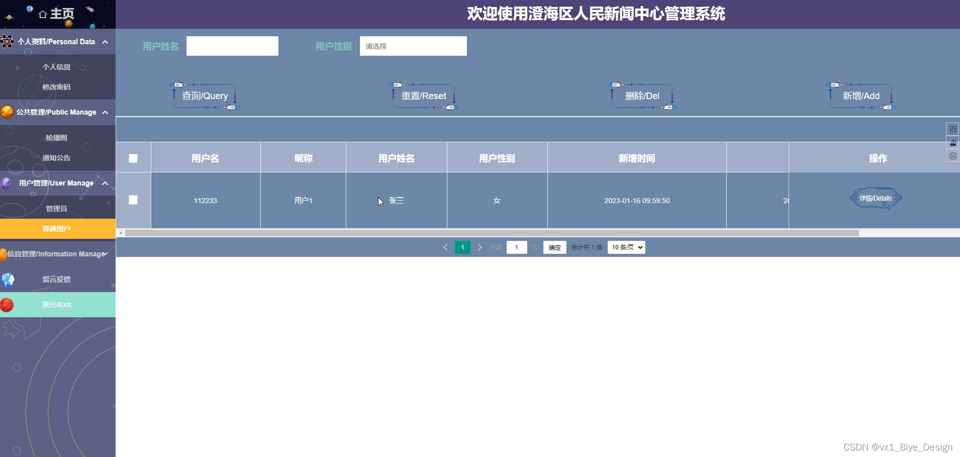 用户管理,管理员在此页面可以查看用户名,昵称,用户姓名,性别等信息,并可根据需要进行查询,重置,删除,新增等操作, 如图5-5,5-6所示。