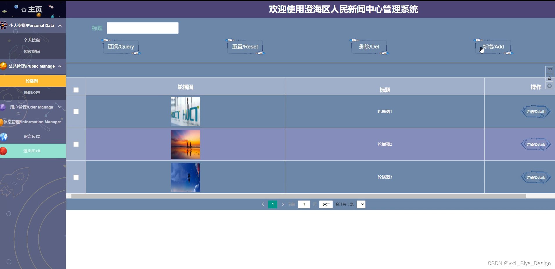轮播图管理,在此页面可以查看轮播图封面图,标题等信息,并可根据需要进行查询,重置,删除,新增等操作,如图5-3所示。