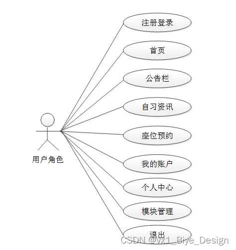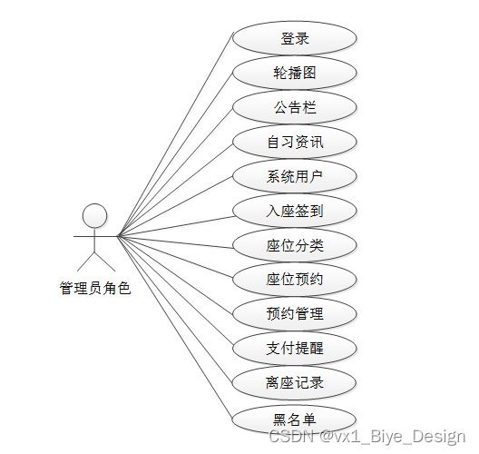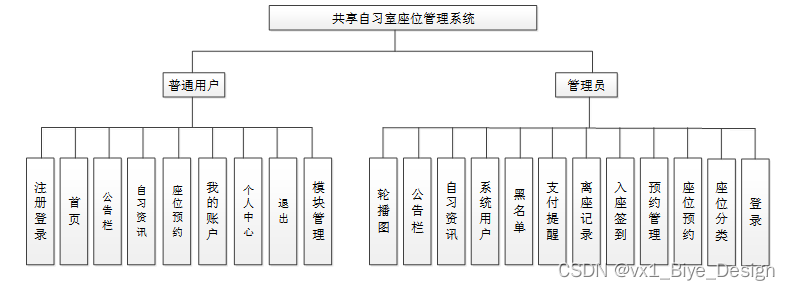 共享自习室座位管理系统从角色上划分为了管理员以及普通用户两种角色。