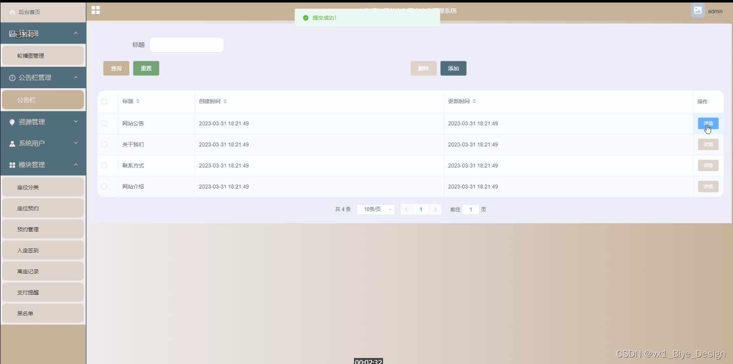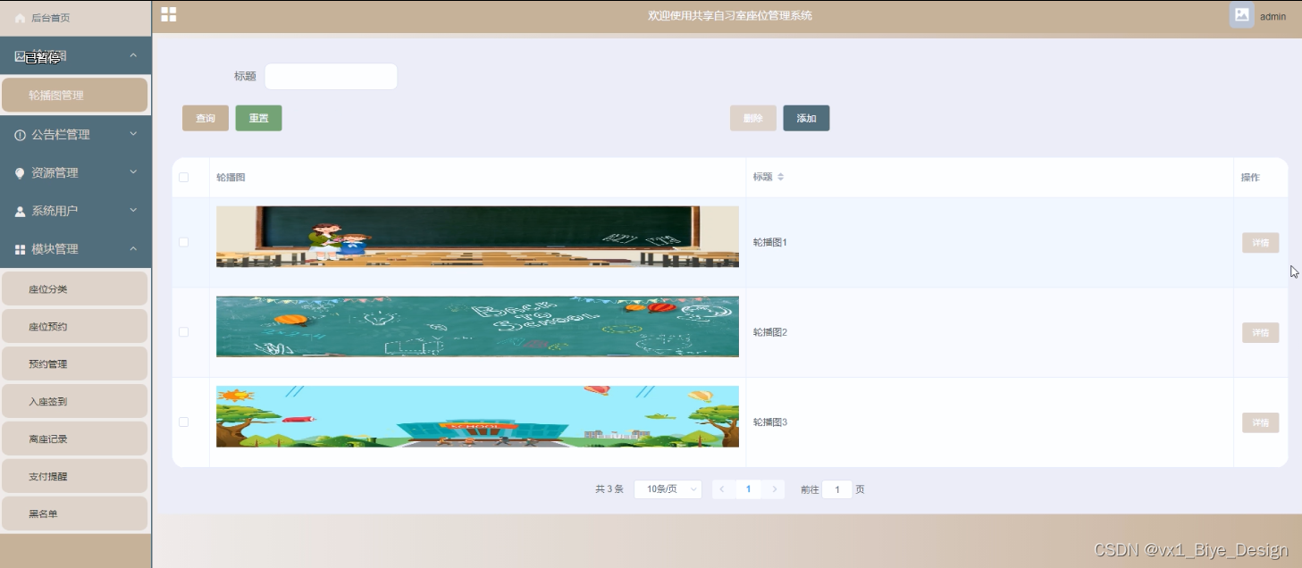 (2)轮播图/公告栏管理:管理员可以对系统前台展示的轮播图以及公告栏进行增删改查,方便用户进行查看。
